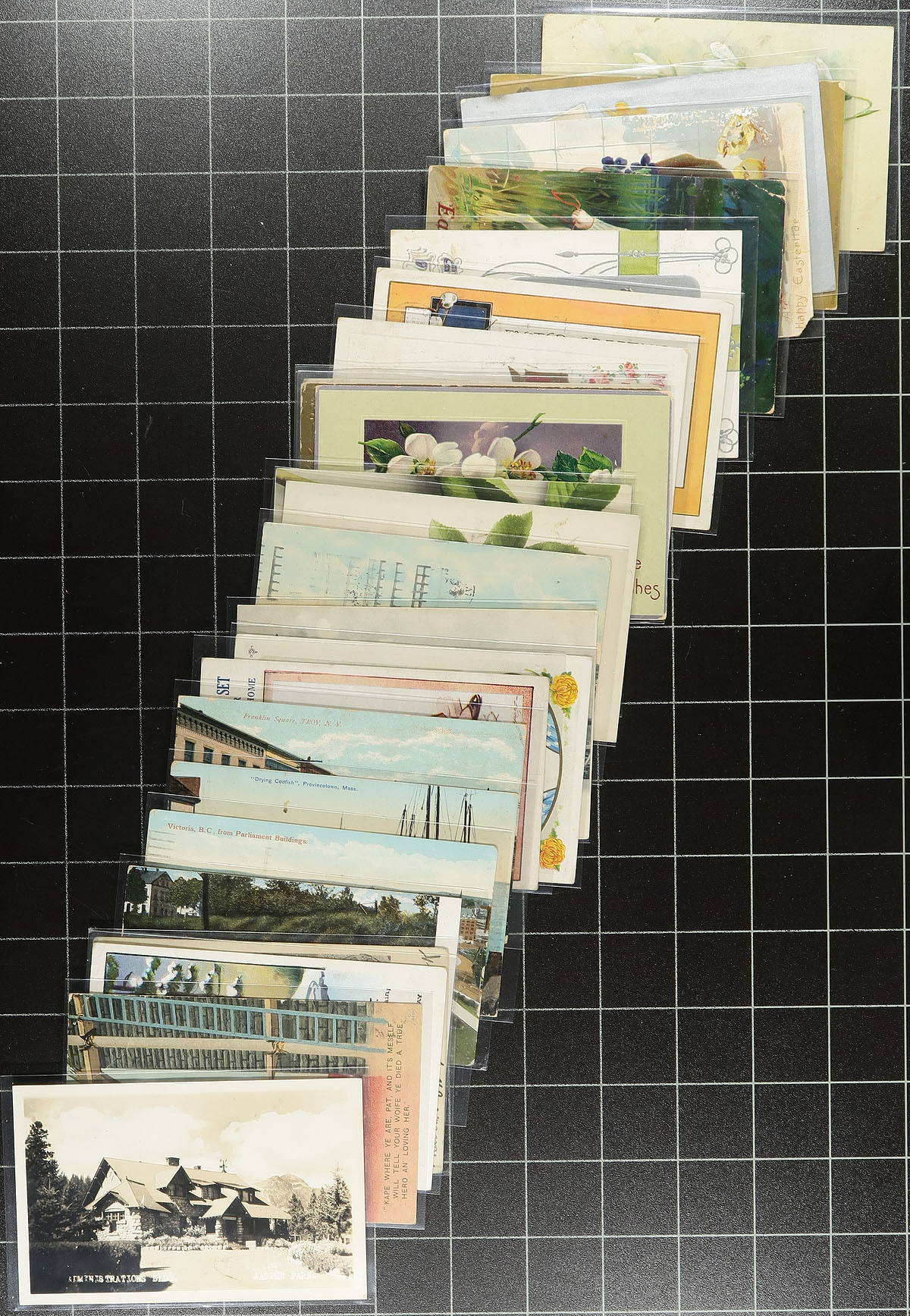 Dealer's Estate Postcard Box. A cardboard "show-box" filled with about 400 postcards, primarily Canada / USA / UK, with a touch of misc Worldwide / Greetings etc. Far better than your usual holding, with almost all being individually sleeved and many priced lightly on the back in pencil (noted many priced at $20+). Take a good look at the sample pictures to get an idea of the quality/contents are. Well worth the reasonable estimate at less than 50c per item. Estimate =