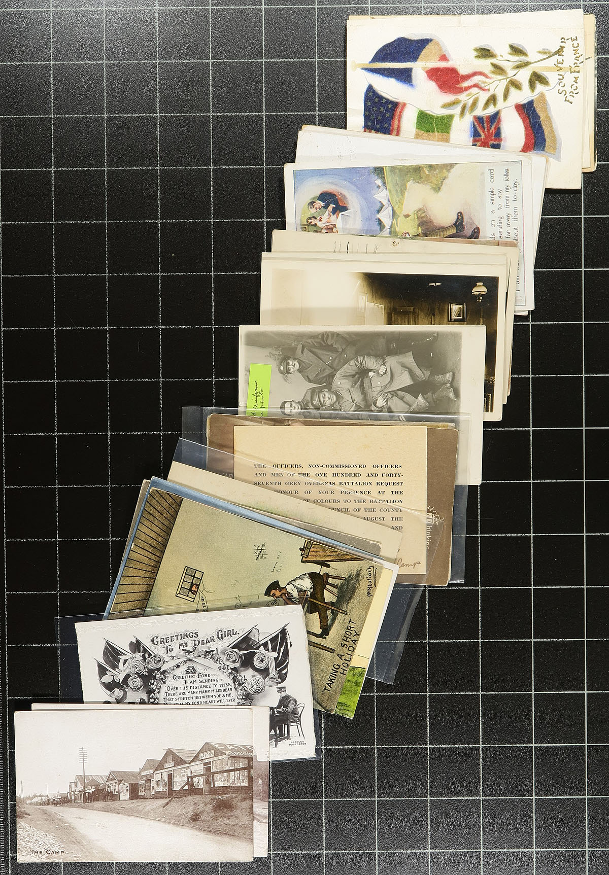Wartime Themed Collection. A collector's accumulation of 270 postcards, all with a Military / War theme, primarily from WWI (but also a few later WWII). A fascinating selection which looks to be mostly GB / Europe / Canada centered, including both printed views and RPPC (real photo postcards). Many better subjects including Camp, Hospitals, Injured Troops, Soldiers, Patriotic, War Effort, "In the Trenches", Illustrated Art etc. Most of these would retail in the $5-$10 each range. An excellent opportunity to pick up a large holding of these always popular postcards. Estimate =