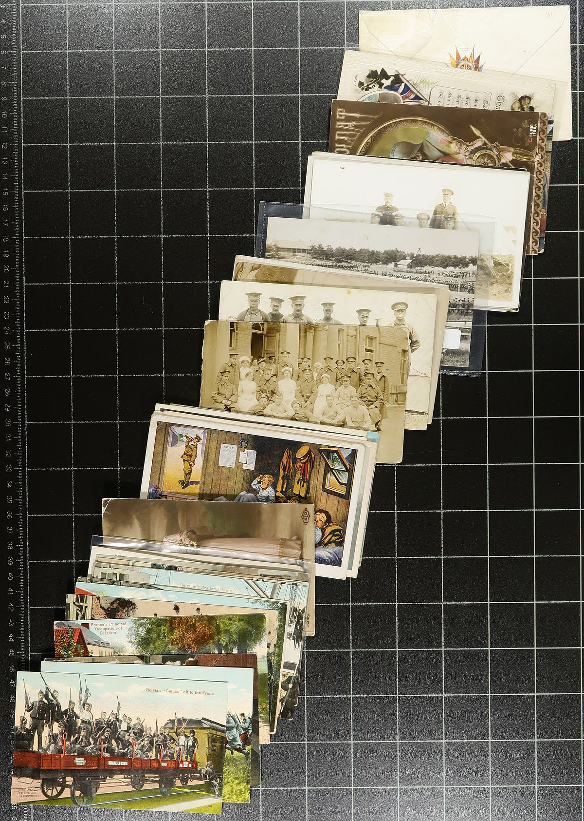 Wartime Themed Collection. A collector's accumulation of 270 postcards, all with a Military / War theme, primarily from WWI (but also a few later WWII). A fascinating selection which looks to be mostly GB / Europe / Canada centered, including both printed views and RPPC (real photo postcards). Many better subjects including Camp, Hospitals, Injured Troops, Soldiers, Patriotic, War Effort, "In the Trenches", Illustrated Art etc. Most of these would retail in the $5-$10 each range. An excellent opportunity to pick up a large holding of these always popular postcards. Estimate =