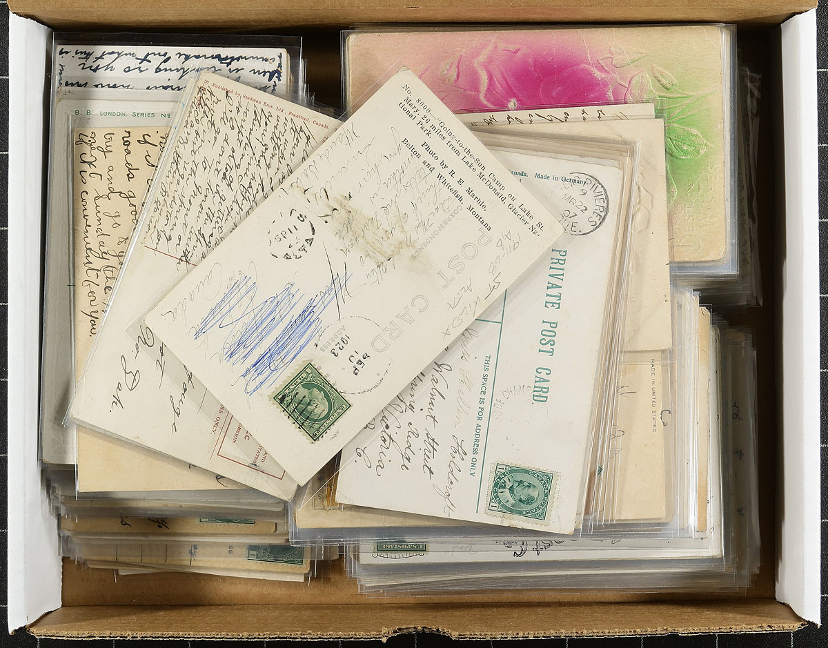 Postmark Holding! An enticing offering of 230 postcards, all selected for having "split ring" postmarks from across the country. This almost exclusively Edward VII / George V offering is all individually sleeved, with many of the towns identified lightly in pencil. Some duplication of towns noted, but overall a very diverse offering, with strength in Ontario, NB and BC. Estimate =