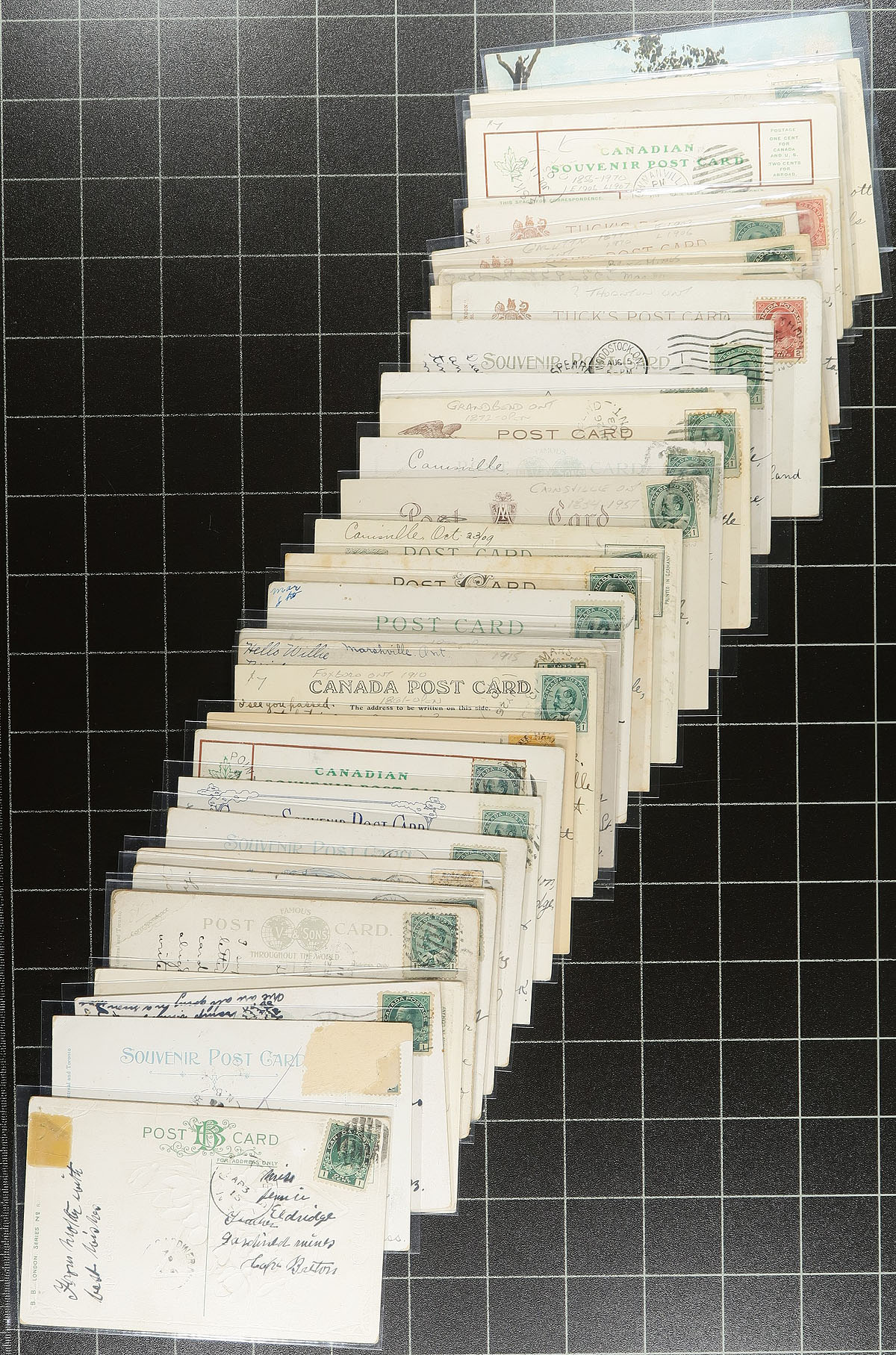 Postmark Holding! An enticing offering of 230 postcards, all selected for having "split ring" postmarks from across the country. This almost exclusively Edward VII / George V offering is all individually sleeved, with many of the towns identified lightly in pencil. Some duplication of towns noted, but overall a very diverse offering, with strength in Ontario, NB and BC. Estimate =