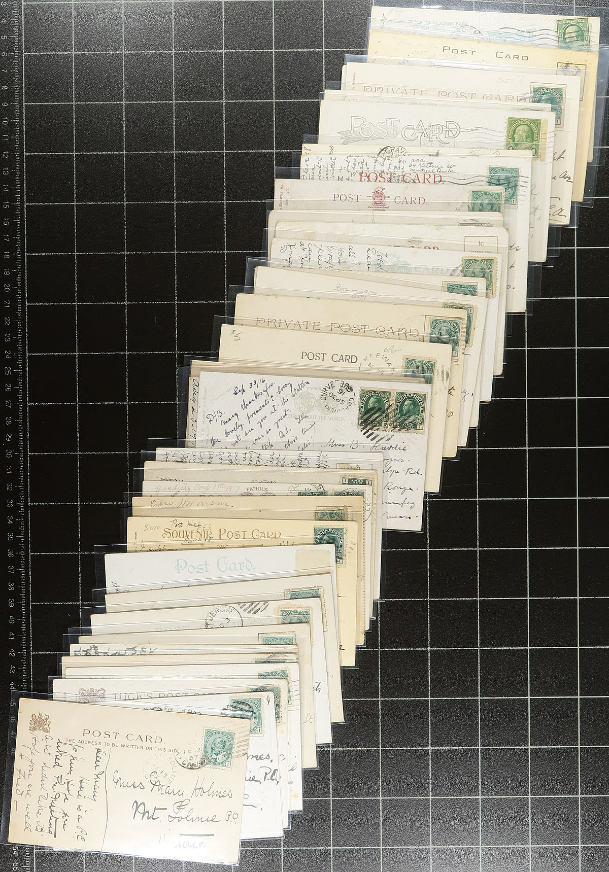 Postmark Holding! An enticing offering of 230 postcards, all selected for having "split ring" postmarks from across the country. This almost exclusively Edward VII / George V offering is all individually sleeved, with many of the towns identified lightly in pencil. Some duplication of towns noted, but overall a very diverse offering, with strength in Ontario, NB and BC. Estimate =