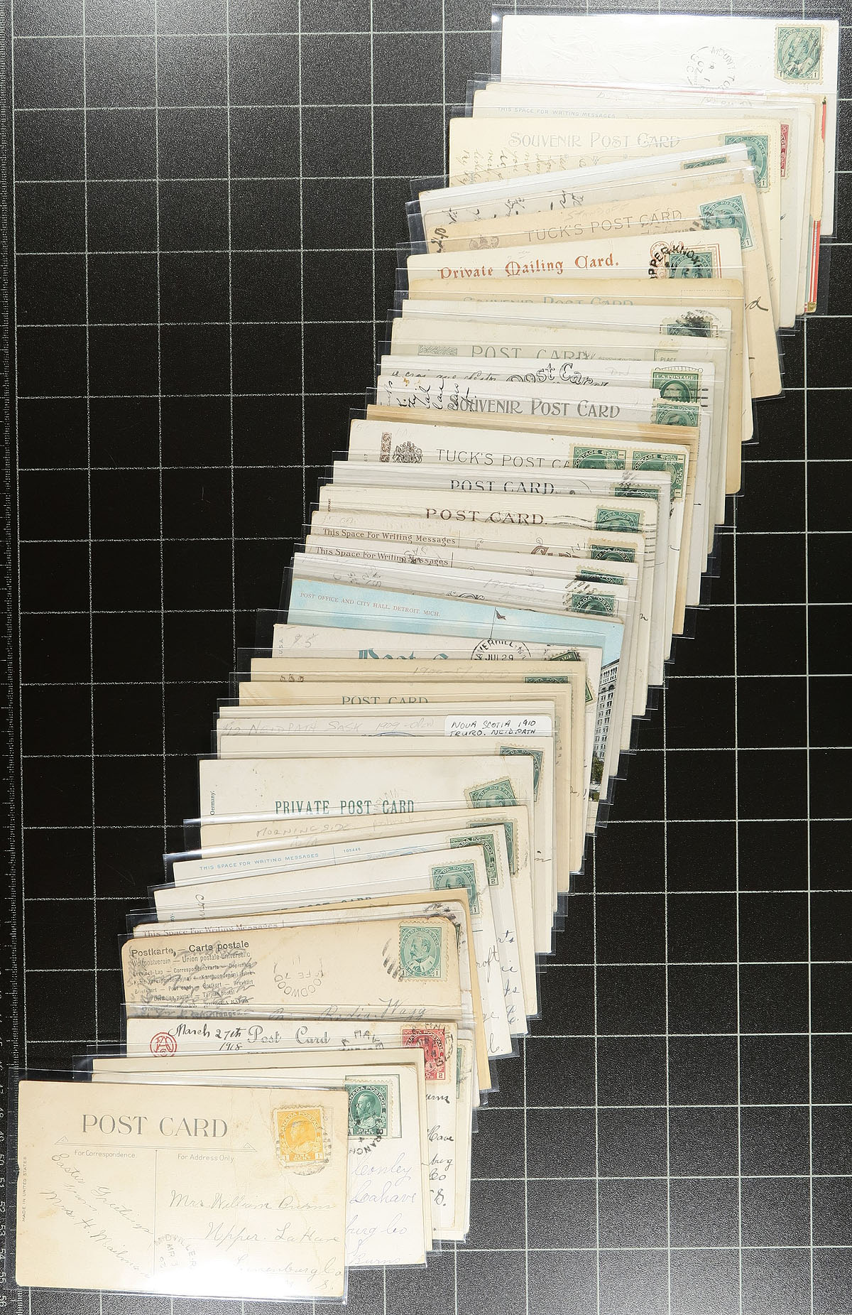 Postmark Holding! An enticing offering of 230 postcards, all selected for having "split ring" postmarks from across the country. This almost exclusively Edward VII / George V offering is all individually sleeved, with many of the towns identified lightly in pencil. Some duplication of towns noted, but overall a very diverse offering, with strength in Ontario, NB and BC. Estimate =