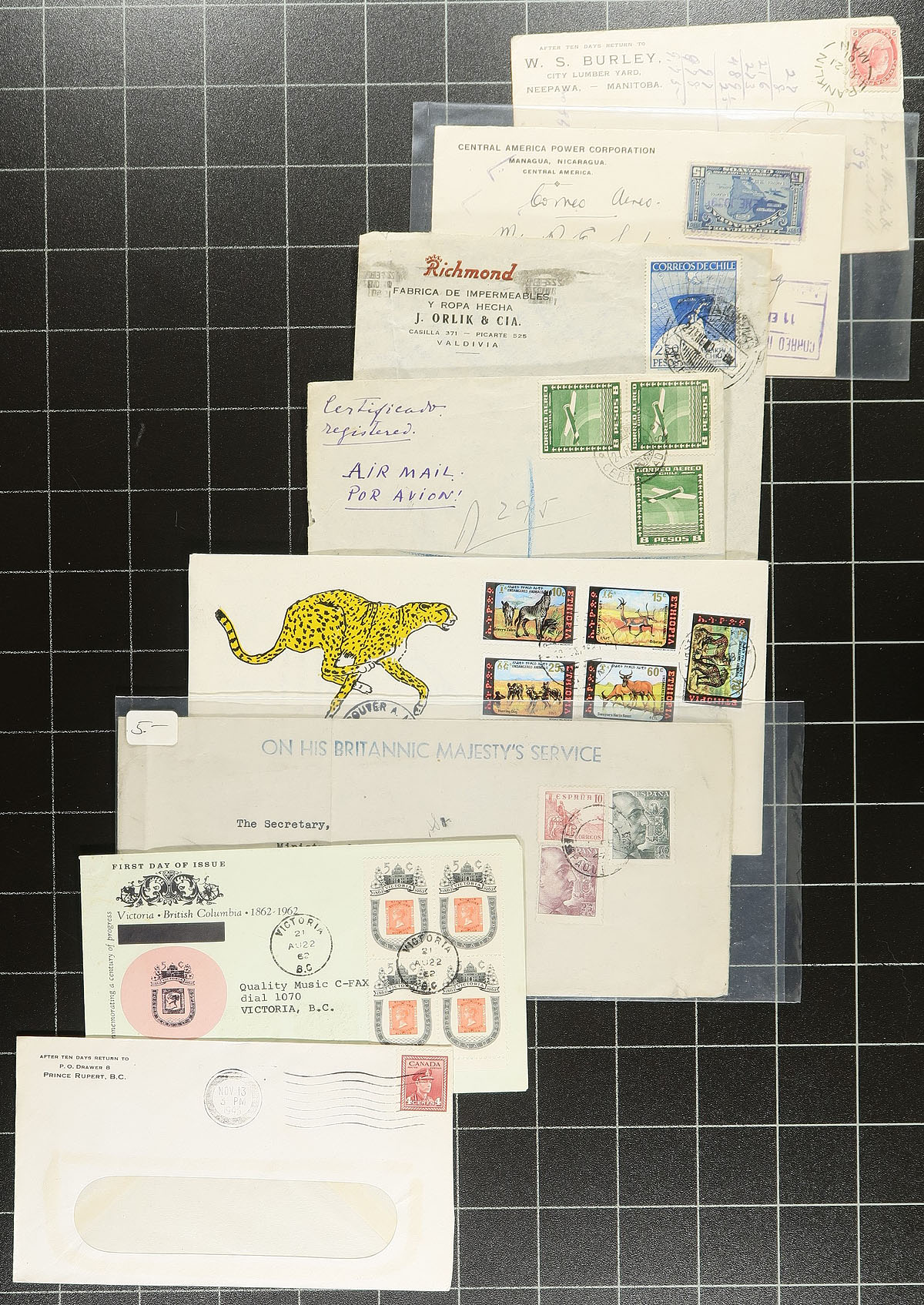 A small felt covered box, filled with a better than average array of covers and postcards from around the world, some still in the original dealer sleeves from when purchased (individual prices up to $30.00). Notable strength in Asia / Southeast Asia (China, Japan, India, Thailand), but also saw Canada, Australia, Europe etc. About 300 items in total, perfect for the collector or show/internet dealer. Estimate =