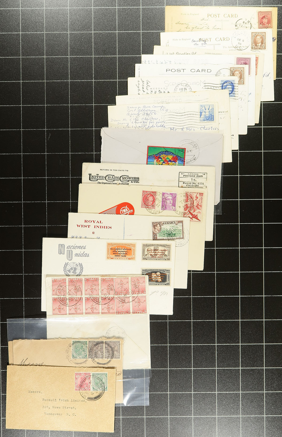 A small felt covered box, filled with a better than average array of covers and postcards from around the world, some still in the original dealer sleeves from when purchased (individual prices up to $30.00). Notable strength in Asia / Southeast Asia (China, Japan, India, Thailand), but also saw Canada, Australia, Europe etc. About 300 items in total, perfect for the collector or show/internet dealer. Estimate =