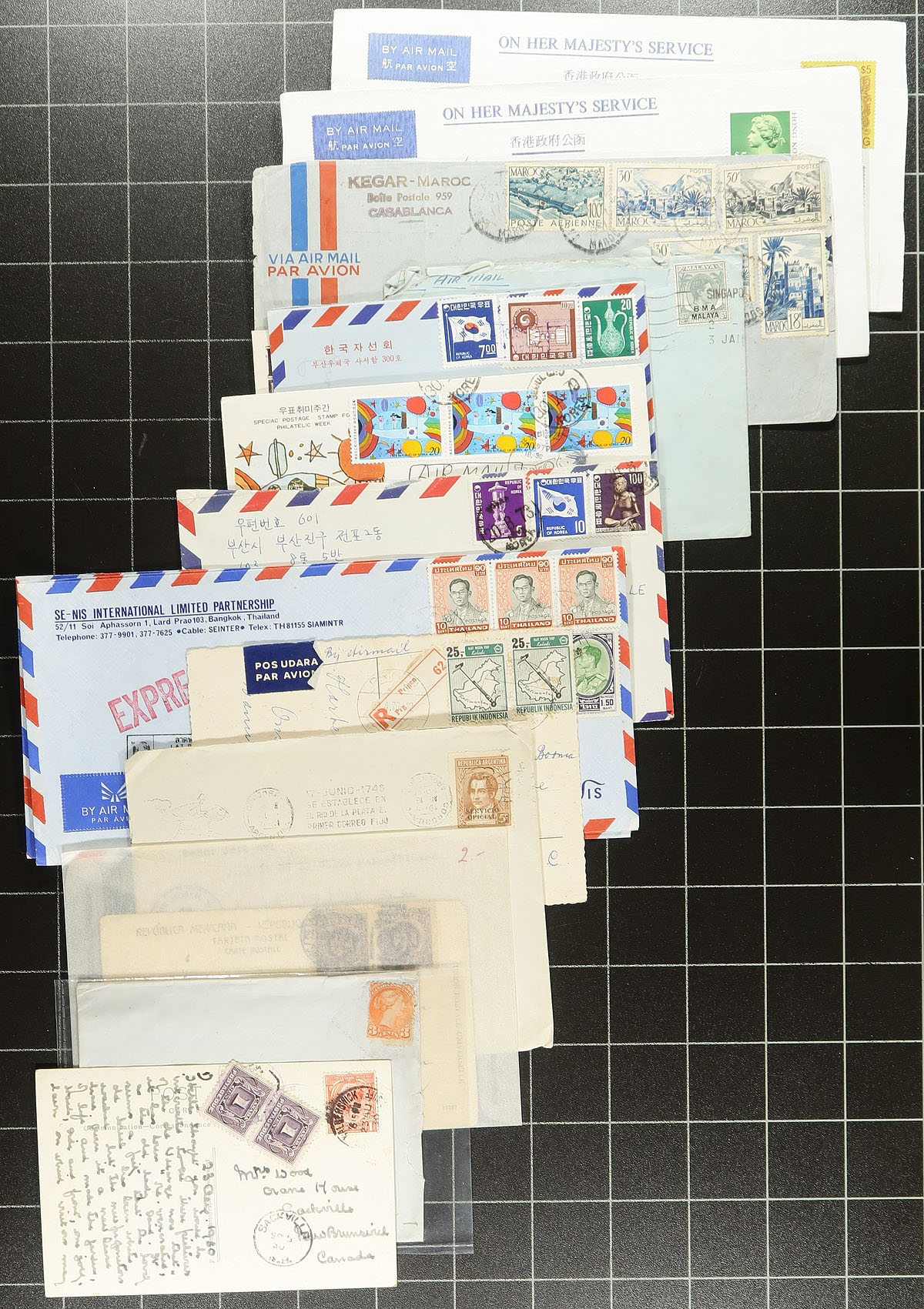 A small felt covered box, filled with a better than average array of covers and postcards from around the world, some still in the original dealer sleeves from when purchased (individual prices up to $30.00). Notable strength in Asia / Southeast Asia (China, Japan, India, Thailand), but also saw Canada, Australia, Europe etc. About 300 items in total, perfect for the collector or show/internet dealer. Estimate =