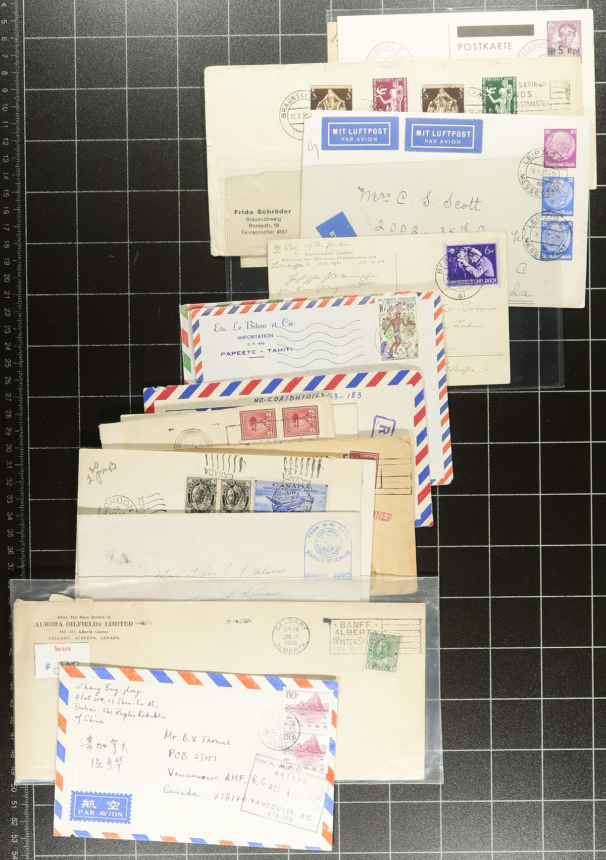 A small felt covered box, filled with a better than average array of covers and postcards from around the world, some still in the original dealer sleeves from when purchased (individual prices up to $30.00). Notable strength in Asia / Southeast Asia (China, Japan, India, Thailand), but also saw Canada, Australia, Europe etc. About 300 items in total, perfect for the collector or show/internet dealer. Estimate =