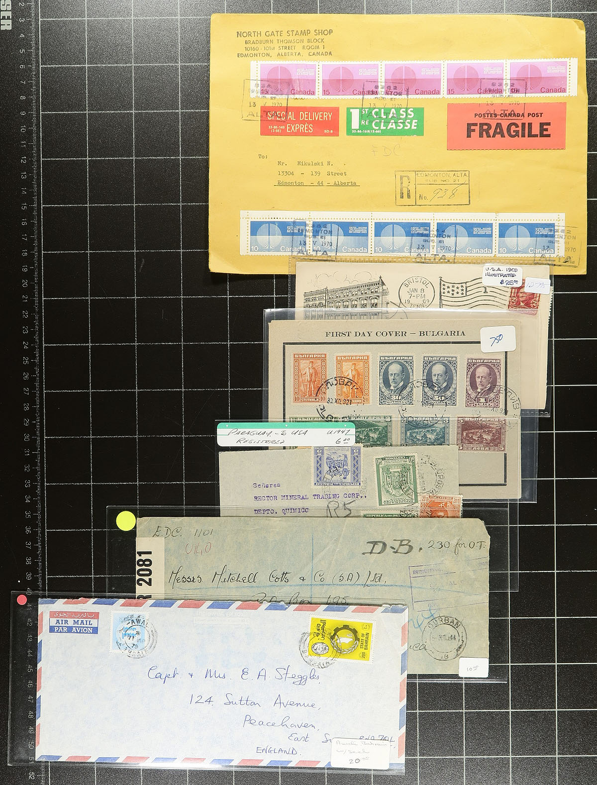 A small felt covered box, filled with a better than average array of covers and postcards from around the world, some still in the original dealer sleeves from when purchased (individual prices up to $30.00). Notable strength in Asia / Southeast Asia (China, Japan, India, Thailand), but also saw Canada, Australia, Europe etc. About 300 items in total, perfect for the collector or show/internet dealer. Estimate =