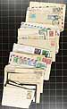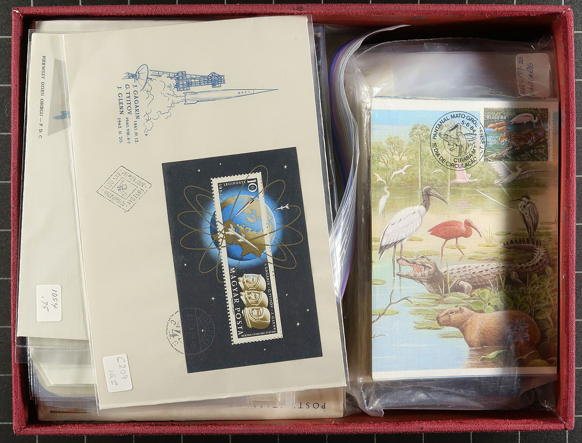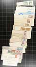 A small felt covered box, second offering from the above estate, this time with a more focused offering of different groupings (most of which were individual bidboard lots at one time). Includes (in no particular order) 1) Bermuda, with over 100 covers, mostly 1900-WWII, including a large part local correspondence. 2) Brazil maximum cards 1984-1987, 154 in total, with a high original Post Office cost. 3) Italy 1960's / 1970's FDC, a bundle of 98 different covers. 4) PRC China pre-stamped postcards (about 60 in total). 4) Hungary / Czechoslovakia / Poland / Romania FDC, about 40 in total, primarily from the 1960's, many with "Space" themed singles and sets. A nice clean lot. Estimate =