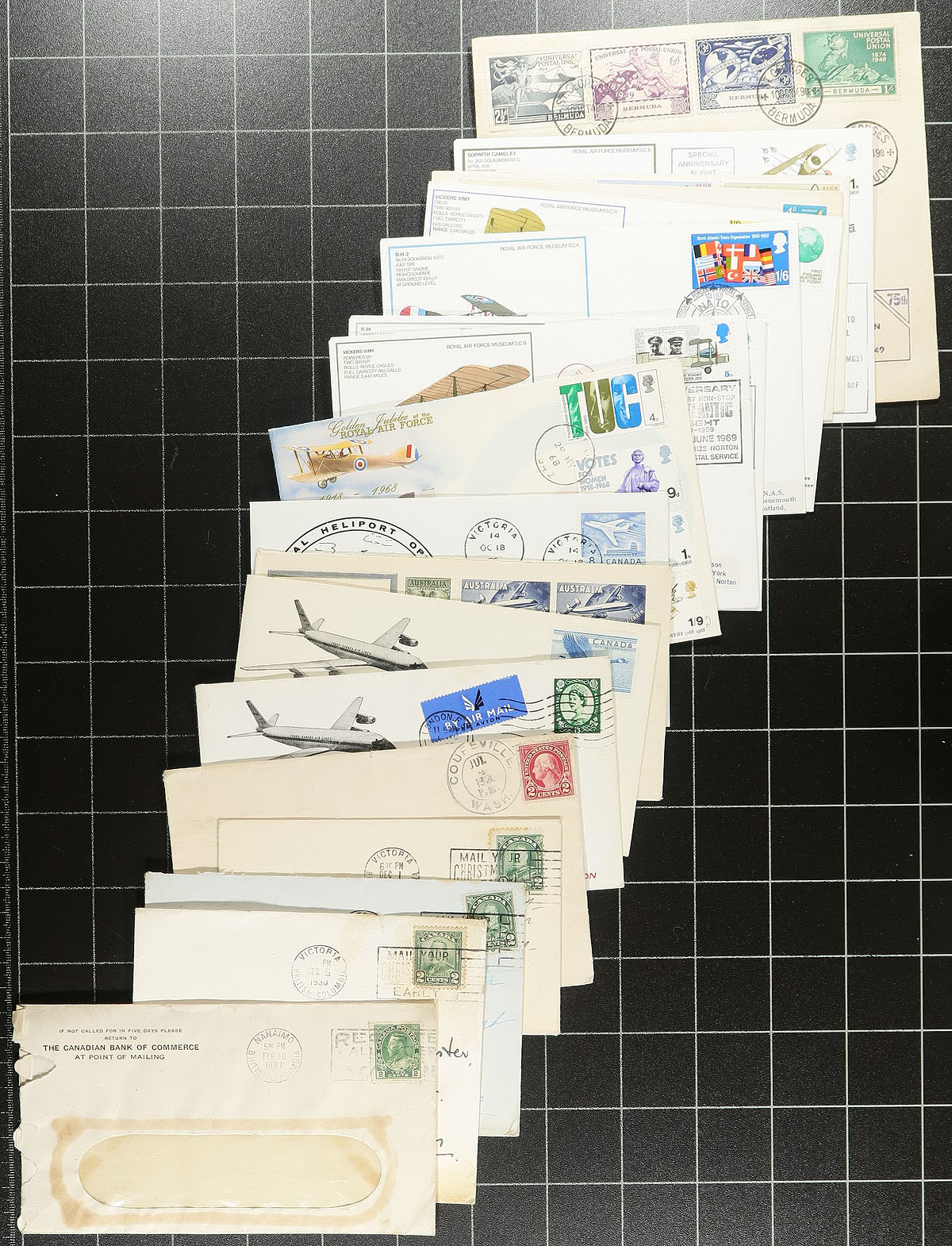A small felt covered box, second offering from the above estate, this time with a more focused offering of different groupings (most of which were individual bidboard lots at one time). Includes (in no particular order) 1) Bermuda, with over 100 covers, mostly 1900-WWII, including a large part local correspondence. 2) Brazil maximum cards 1984-1987, 154 in total, with a high original Post Office cost. 3) Italy 1960's / 1970's FDC, a bundle of 98 different covers. 4) PRC China pre-stamped postcards (about 60 in total). 4) Hungary / Czechoslovakia / Poland / Romania FDC, about 40 in total, primarily from the 1960's, many with "Space" themed singles and sets. A nice clean lot. Estimate =