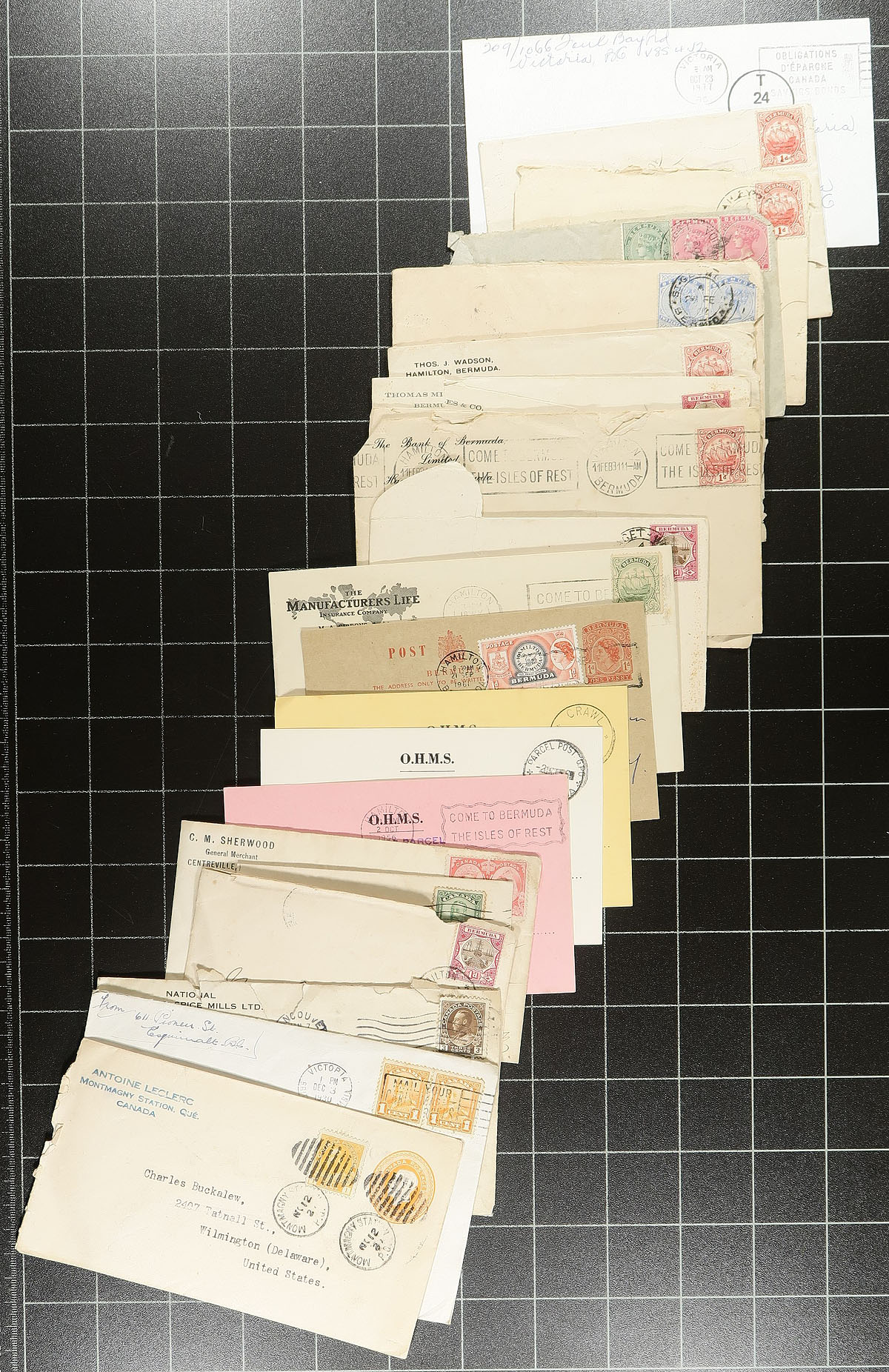 A small felt covered box, second offering from the above estate, this time with a more focused offering of different groupings (most of which were individual bidboard lots at one time). Includes (in no particular order) 1) Bermuda, with over 100 covers, mostly 1900-WWII, including a large part local correspondence. 2) Brazil maximum cards 1984-1987, 154 in total, with a high original Post Office cost. 3) Italy 1960's / 1970's FDC, a bundle of 98 different covers. 4) PRC China pre-stamped postcards (about 60 in total). 4) Hungary / Czechoslovakia / Poland / Romania FDC, about 40 in total, primarily from the 1960's, many with "Space" themed singles and sets. A nice clean lot. Estimate =