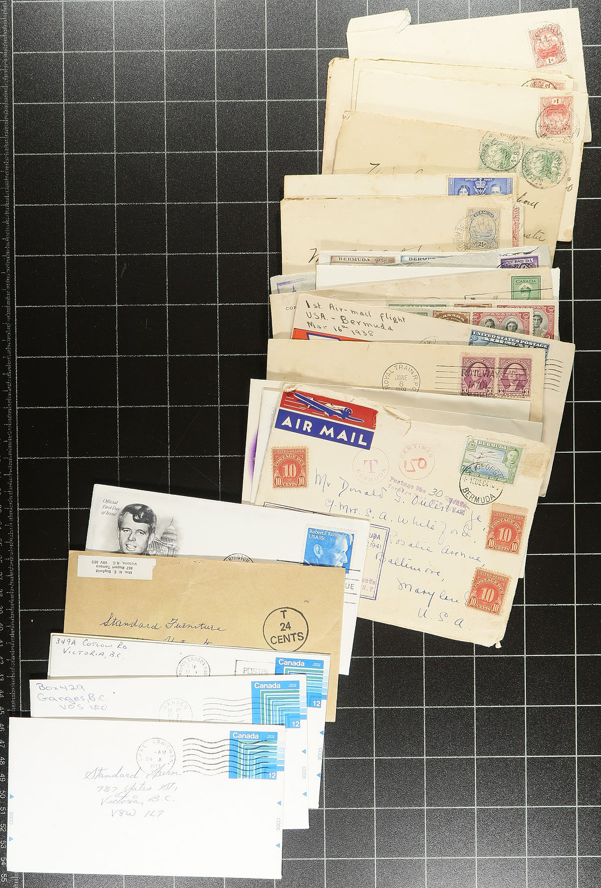 A small felt covered box, second offering from the above estate, this time with a more focused offering of different groupings (most of which were individual bidboard lots at one time). Includes (in no particular order) 1) Bermuda, with over 100 covers, mostly 1900-WWII, including a large part local correspondence. 2) Brazil maximum cards 1984-1987, 154 in total, with a high original Post Office cost. 3) Italy 1960's / 1970's FDC, a bundle of 98 different covers. 4) PRC China pre-stamped postcards (about 60 in total). 4) Hungary / Czechoslovakia / Poland / Romania FDC, about 40 in total, primarily from the 1960's, many with "Space" themed singles and sets. A nice clean lot. Estimate =