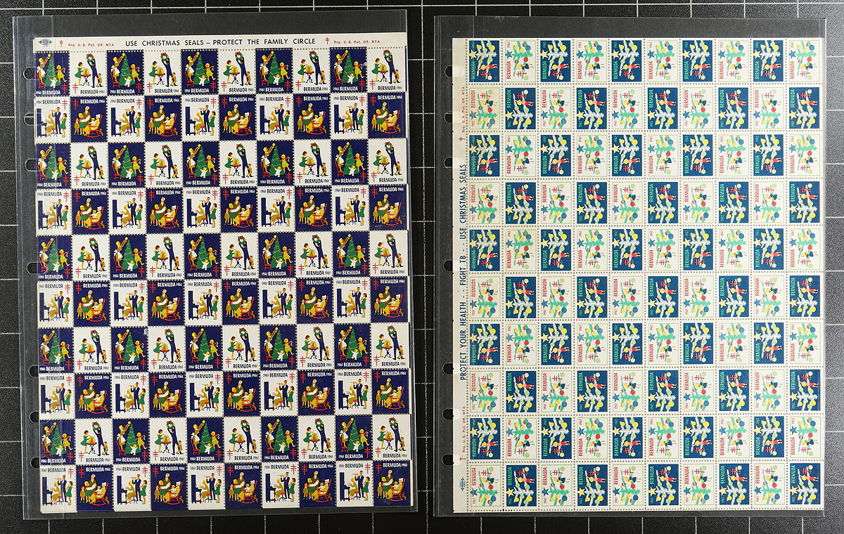 Christmas Seals. Complete run of Bermuda TB Christmas Seals 1945-1963 (inclusive, 19 in total) in pristine complete sheets of 100 labels. Using the same design as the North American issues, but with Bermuda printed specifically (1946-1963). We have not handled anything like these before, offered intact from the estate of a local Victoria BC collector who lived in Bermuda during this time. Estimate =
