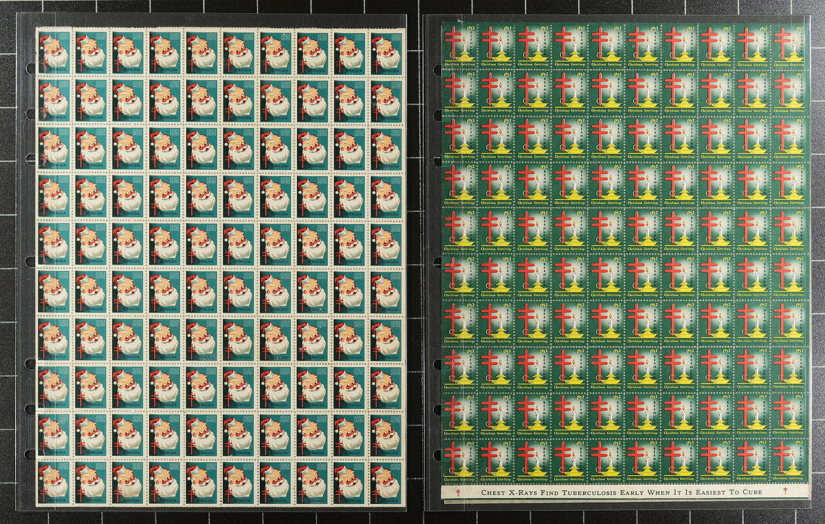 Christmas Seals. Complete run of Bermuda TB Christmas Seals 1945-1963 (inclusive, 19 in total) in pristine complete sheets of 100 labels. Using the same design as the North American issues, but with Bermuda printed specifically (1946-1963). We have not handled anything like these before, offered intact from the estate of a local Victoria BC collector who lived in Bermuda during this time. Estimate =