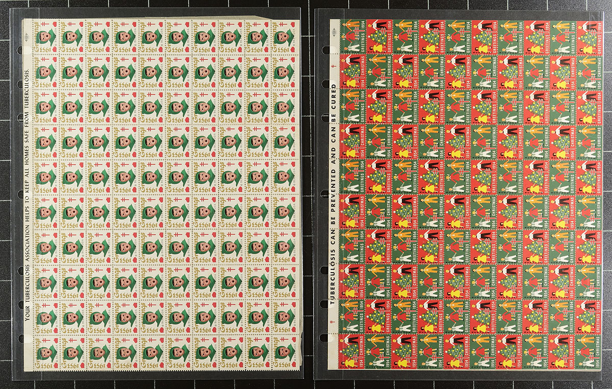 Christmas Seals. Complete run of Bermuda TB Christmas Seals 1945-1963 (inclusive, 19 in total) in pristine complete sheets of 100 labels. Using the same design as the North American issues, but with Bermuda printed specifically (1946-1963). We have not handled anything like these before, offered intact from the estate of a local Victoria BC collector who lived in Bermuda during this time. Estimate =