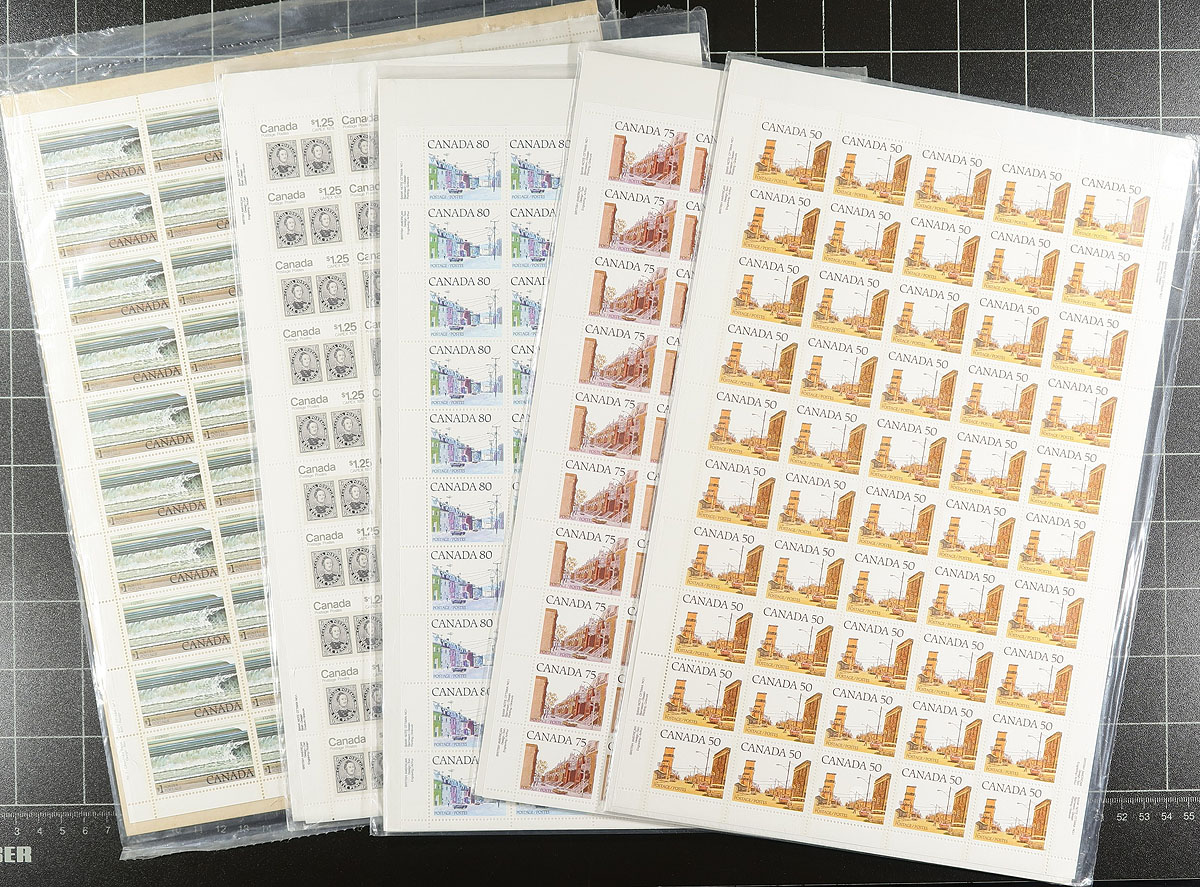 Mint Sheet Holding. An enticing offering of five better sheets, all still in the original Post Office plastic wrap and cardboard/info sheets. Includes the 1979 issued $1.00 Fundy (#726), 1978 issued $1.25 CAPEX (#756) and the three 1978 issued mid-value "Street" definitives (#723, 724, 725). All in sheets of 50 stamps. Catalogued as a matched set of plate blocks, plus singles (but should be worth more as complete sheets). Face value alone is $215.00. 2025/2026 Unitrade =