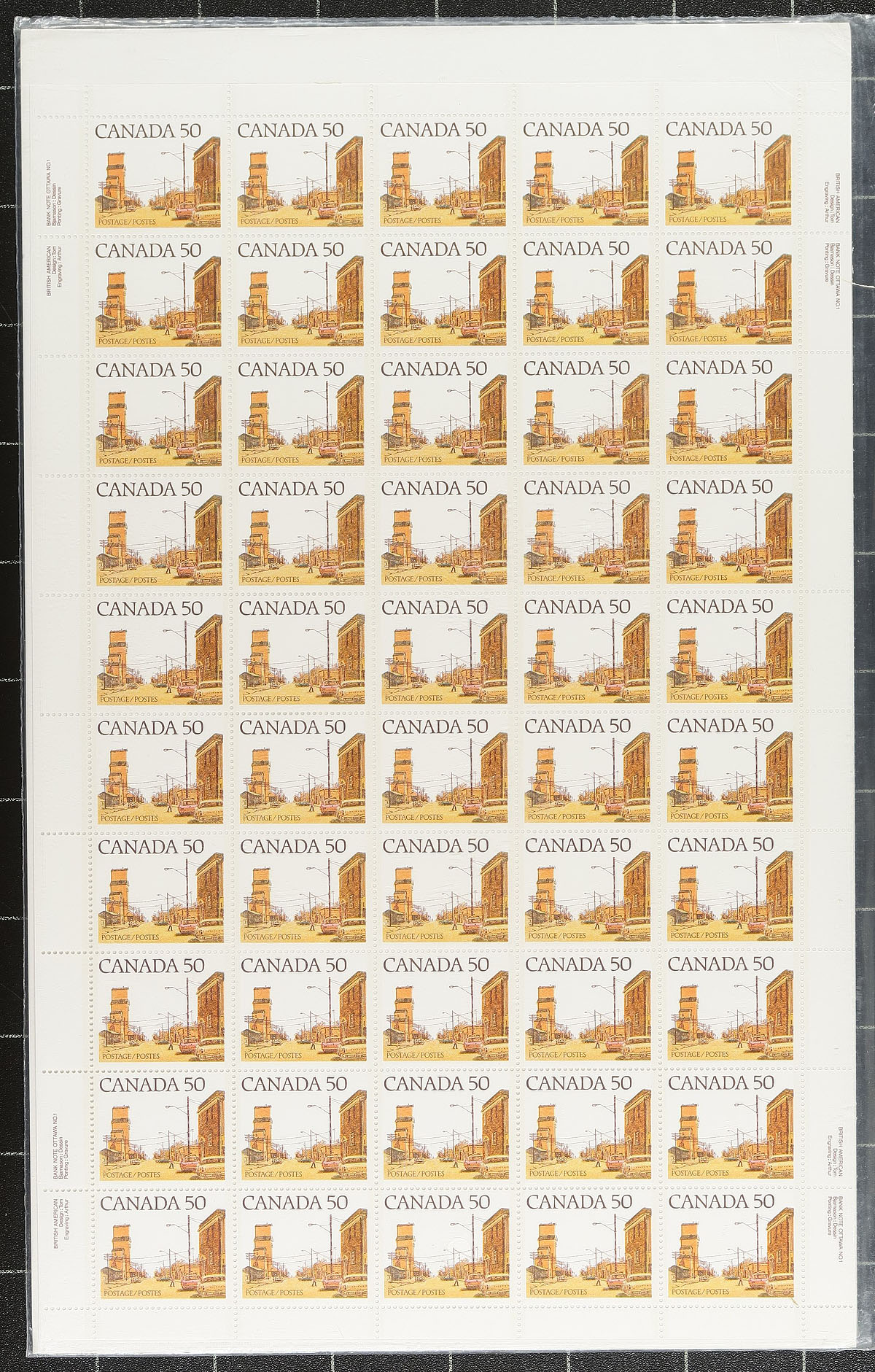 Mint Sheet Holding. An enticing offering of five better sheets, all still in the original Post Office plastic wrap and cardboard/info sheets. Includes the 1979 issued $1.00 Fundy (#726), 1978 issued $1.25 CAPEX (#756) and the three 1978 issued mid-value "Street" definitives (#723, 724, 725). All in sheets of 50 stamps. Catalogued as a matched set of plate blocks, plus singles (but should be worth more as complete sheets). Face value alone is $215.00. 2025/2026 Unitrade =