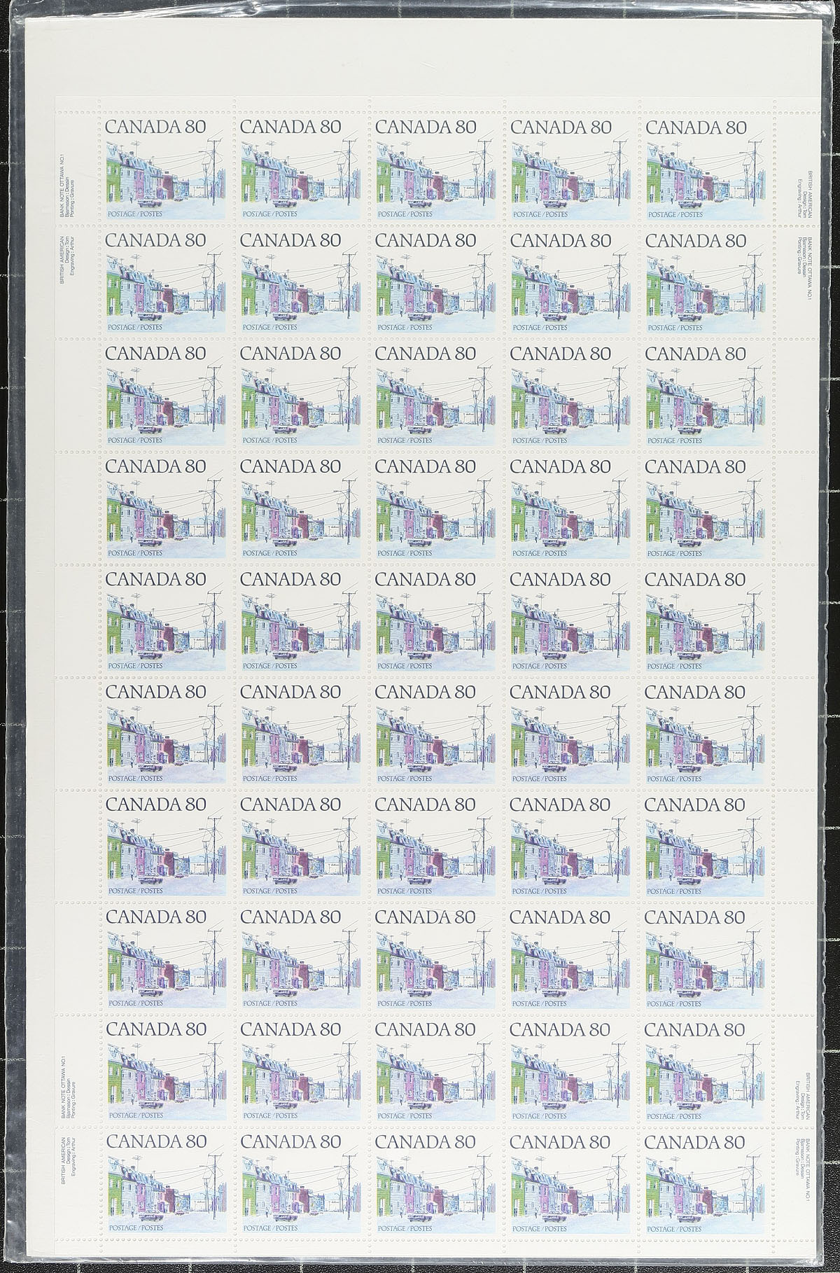 Mint Sheet Holding. An enticing offering of five better sheets, all still in the original Post Office plastic wrap and cardboard/info sheets. Includes the 1979 issued $1.00 Fundy (#726), 1978 issued $1.25 CAPEX (#756) and the three 1978 issued mid-value "Street" definitives (#723, 724, 725). All in sheets of 50 stamps. Catalogued as a matched set of plate blocks, plus singles (but should be worth more as complete sheets). Face value alone is $215.00. 2025/2026 Unitrade =