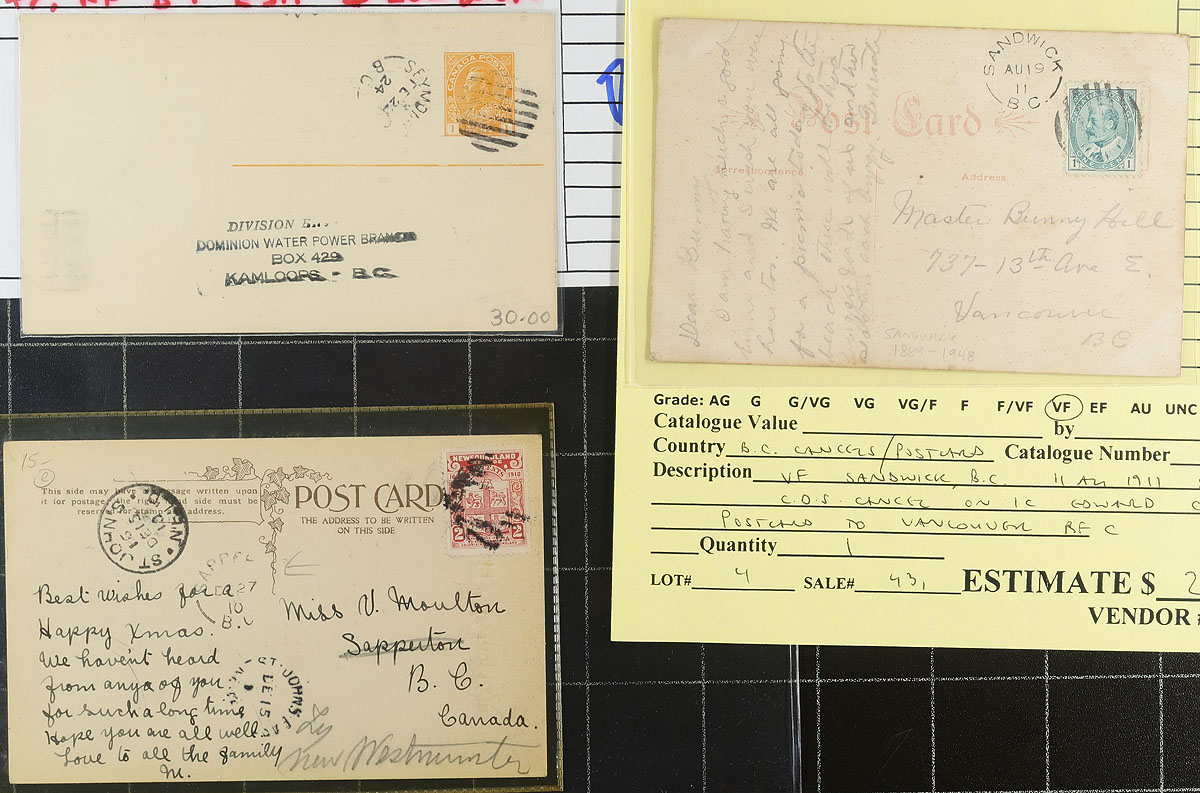 British Columbia Postal History. An estate offering of old bidboard auction cards, all featuring BC postmarks on covers / postcard / pieces. Some of the notable towns include Margurite, Vancouver Airport, Annable, North Bulkley, Fife, Extension, Bralorne, San Josef Bay, Radium Junction, Joyce, Sapperton, Colquitz, Baker, Hupel, Sandwick and Kingsgate. A total of 24 items, sure to please any BC postmark hound. Estimate =