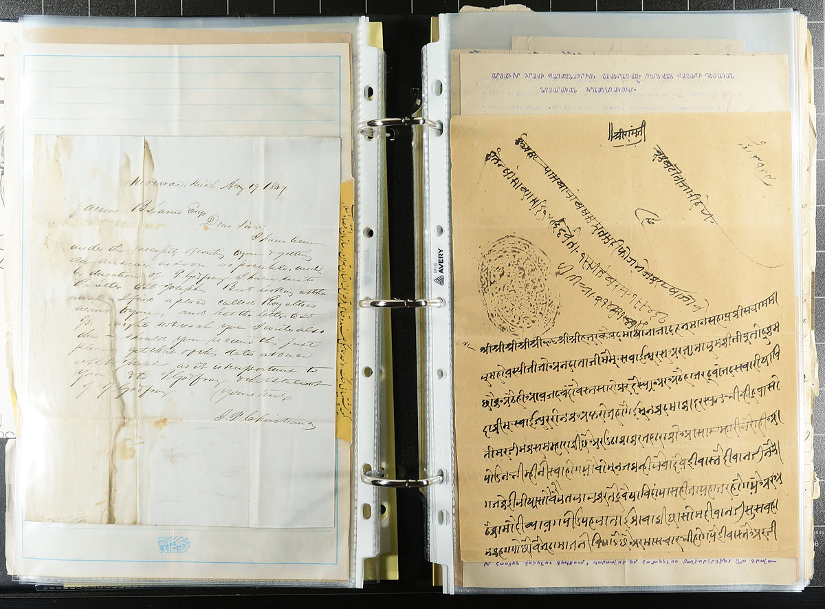 Large format binder (likely a pricy item in itself) filled with a stamp collector's assembly of "paper collectables", some with a stamp theme, others not. Includes a play book signed by William Saroyan (American Playwright / Novelist), Revenue Documents, stampless covers, Election Cards, photographs, India Boer War era Stereoview, Movie Press Books, Consulate Documents (Constantinople) etc. Too much to list here! Take a look at the photos (every item pictured) to appreciate the scope/value of the holding. Estimate =