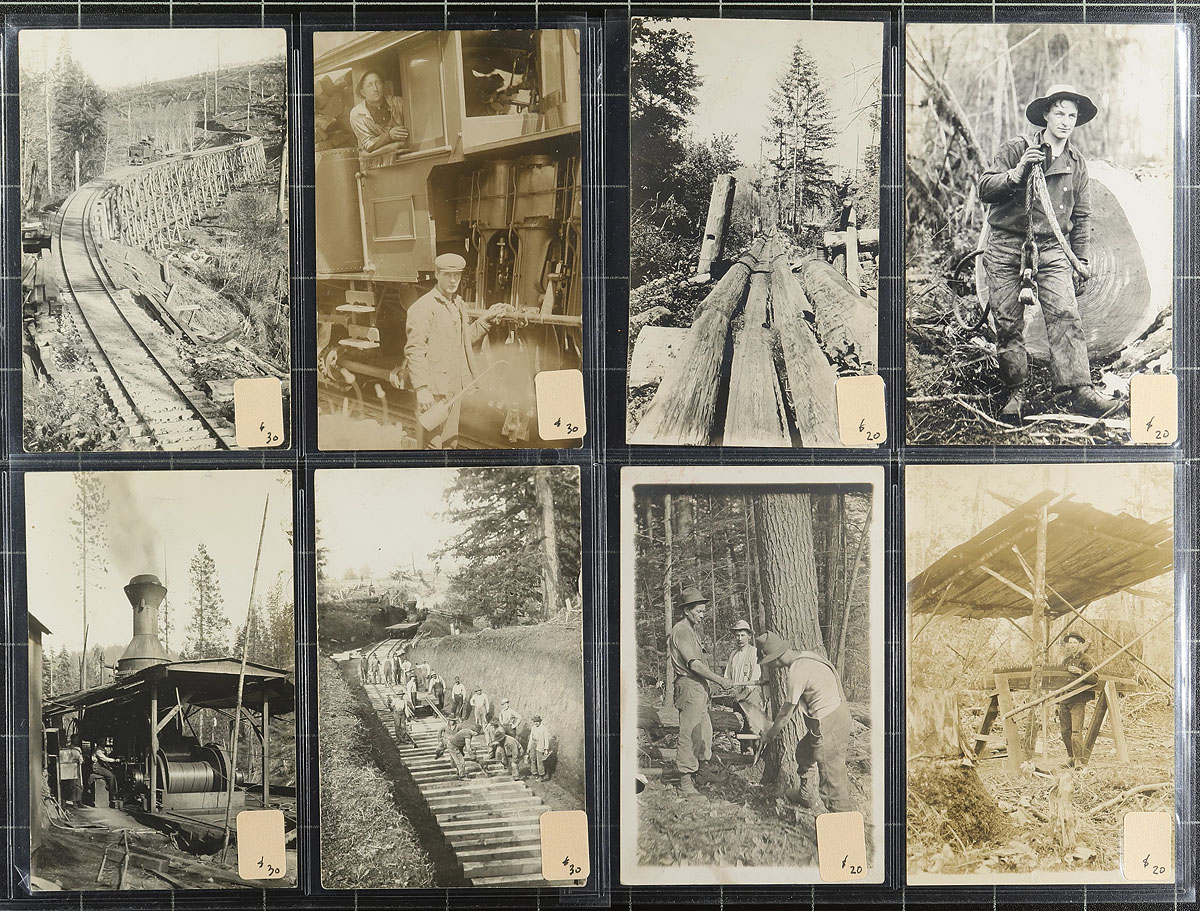 Logging Topical Real Photo Postcard Holding. A tremendously visually enticing offering of 65 Real Photo Postcards, all looking to be pre-1920 featuring logging scenes. All neatly arranged on clear pages, individually sleeved (and dealer priced). While these are not attributed to a specific location, they mostly appear to feature logging operations that would be typical of "west coast" British Columbia / Washington / Oregon. A wonderful social history / logging operation in-sight from an industry at the time that shaped the province / states as we know them today. Take a trip back in time with this lot! The dealer prices add up to $1425.00. An excellent opportunity to acquire a group of better postcards, not often offered in quantity. Estimate =