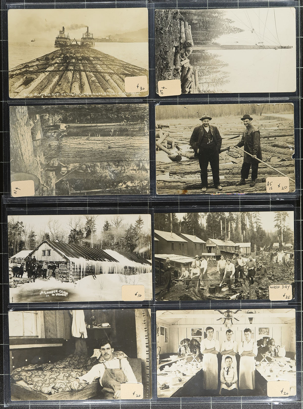Logging Topical Real Photo Postcard Holding. A tremendously visually enticing offering of 65 Real Photo Postcards, all looking to be pre-1920 featuring logging scenes. All neatly arranged on clear pages, individually sleeved (and dealer priced). While these are not attributed to a specific location, they mostly appear to feature logging operations that would be typical of "west coast" British Columbia / Washington / Oregon. A wonderful social history / logging operation in-sight from an industry at the time that shaped the province / states as we know them today. Take a trip back in time with this lot! The dealer prices add up to $1425.00. An excellent opportunity to acquire a group of better postcards, not often offered in quantity. Estimate =