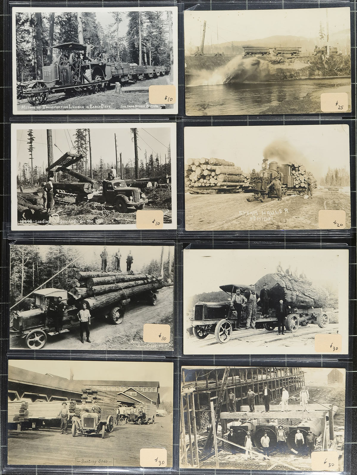 Logging Topical Real Photo Postcard Holding. A tremendously visually enticing offering of 65 Real Photo Postcards, all looking to be pre-1920 featuring logging scenes. All neatly arranged on clear pages, individually sleeved (and dealer priced). While these are not attributed to a specific location, they mostly appear to feature logging operations that would be typical of "west coast" British Columbia / Washington / Oregon. A wonderful social history / logging operation in-sight from an industry at the time that shaped the province / states as we know them today. Take a trip back in time with this lot! The dealer prices add up to $1425.00. An excellent opportunity to acquire a group of better postcards, not often offered in quantity. Estimate =