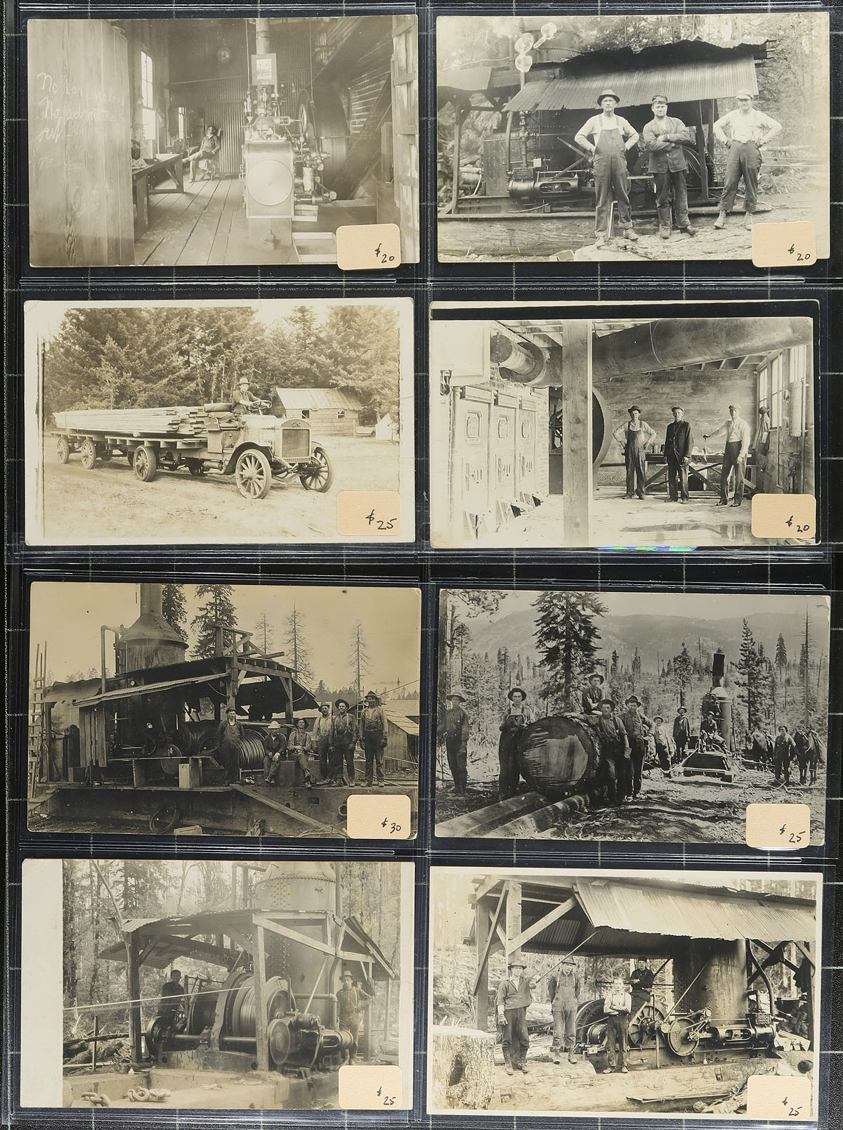 Logging Topical Real Photo Postcard Holding. A tremendously visually enticing offering of 65 Real Photo Postcards, all looking to be pre-1920 featuring logging scenes. All neatly arranged on clear pages, individually sleeved (and dealer priced). While these are not attributed to a specific location, they mostly appear to feature logging operations that would be typical of "west coast" British Columbia / Washington / Oregon. A wonderful social history / logging operation in-sight from an industry at the time that shaped the province / states as we know them today. Take a trip back in time with this lot! The dealer prices add up to $1425.00. An excellent opportunity to acquire a group of better postcards, not often offered in quantity. Estimate =