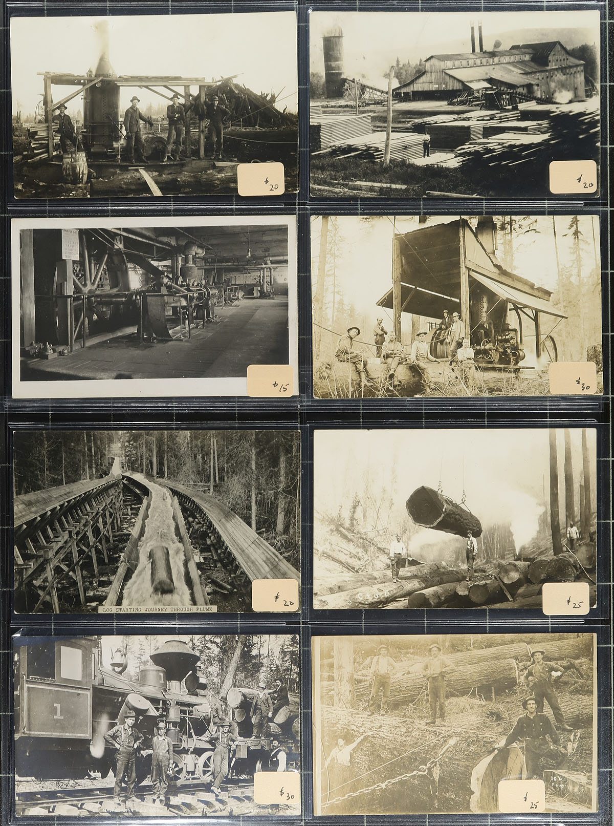 Logging Topical Real Photo Postcard Holding. A tremendously visually enticing offering of 65 Real Photo Postcards, all looking to be pre-1920 featuring logging scenes. All neatly arranged on clear pages, individually sleeved (and dealer priced). While these are not attributed to a specific location, they mostly appear to feature logging operations that would be typical of "west coast" British Columbia / Washington / Oregon. A wonderful social history / logging operation in-sight from an industry at the time that shaped the province / states as we know them today. Take a trip back in time with this lot! The dealer prices add up to $1425.00. An excellent opportunity to acquire a group of better postcards, not often offered in quantity. Estimate =