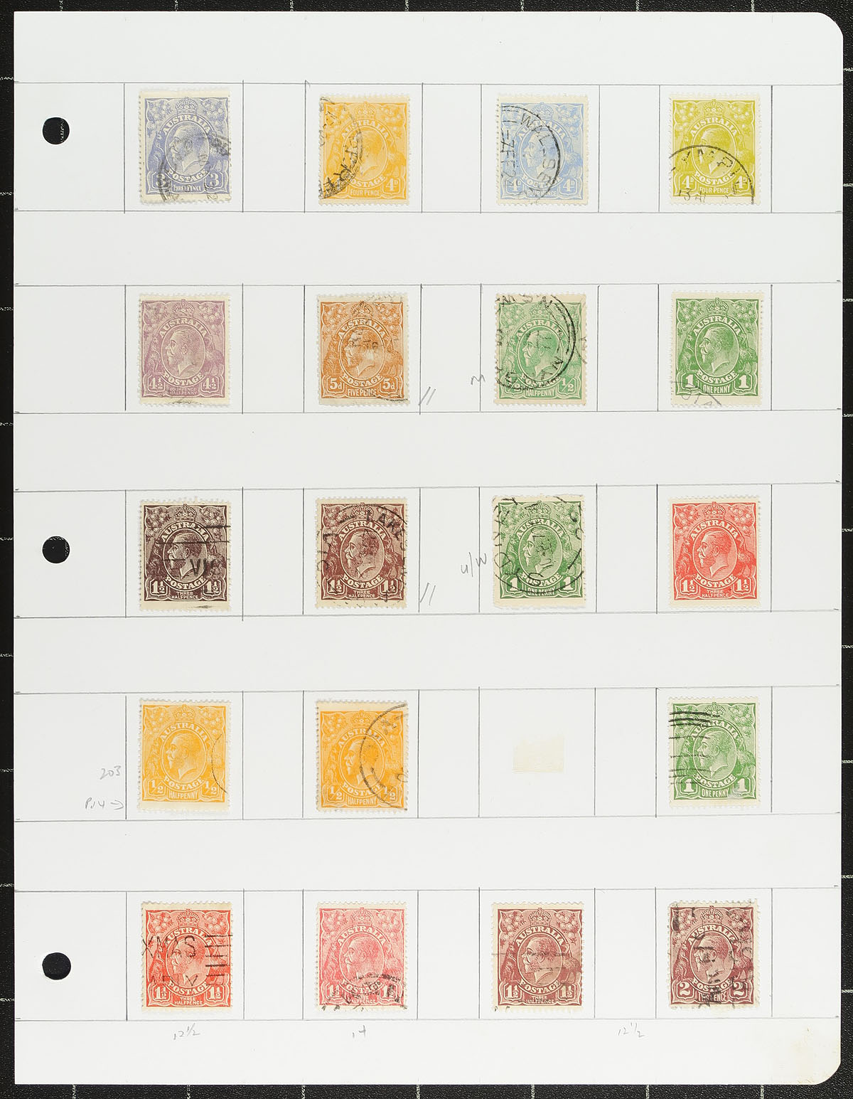 Well organized collection of used Australia, 1913-1998, containing roughly 1,400 stamps on about 100 homemade pages housed in a binder. This well organized collection generally ranges from Scott #1/1705, including a good selection of Kangaroos and KGV Heads, along with singles, sets, and partial sets, with a few cataloguing $10 and up. We estimate roughly 75% completeness in period, and should be continued until complete. Online photos show a sampling, overall fine to very fine. Estimate =