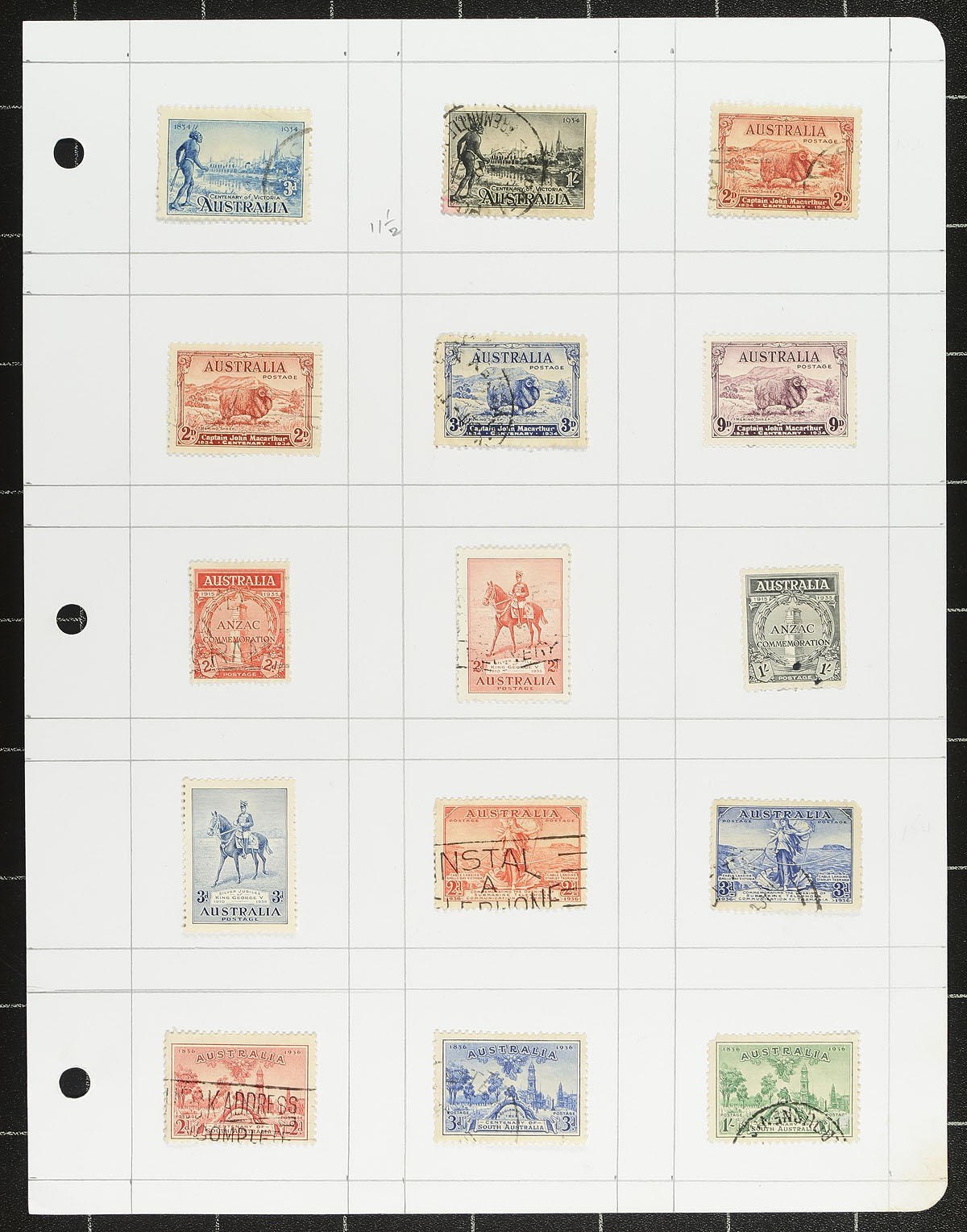 Well organized collection of used Australia, 1913-1998, containing roughly 1,400 stamps on about 100 homemade pages housed in a binder. This well organized collection generally ranges from Scott #1/1705, including a good selection of Kangaroos and KGV Heads, along with singles, sets, and partial sets, with a few cataloguing $10 and up. We estimate roughly 75% completeness in period, and should be continued until complete. Online photos show a sampling, overall fine to very fine. Estimate =