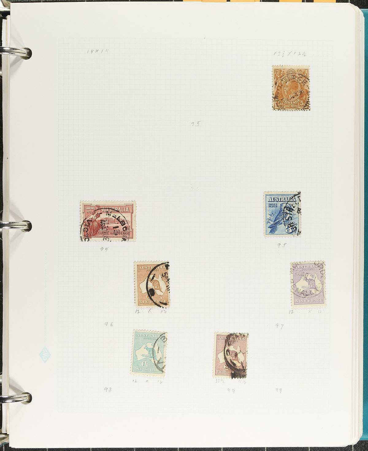 Nice collection of primarily used Australia. 1913-1999, containing roughly 1,500 stamps on over 85 homemade pages housed in a thick binder. This well organized collection generally ranges from Scott #1/1746. including a good selection of used Kangaroos with #s 5, 6 (x2), 8-10. 38-39, 42, 45-52, along with KGV Heads, several sets and partial sets, and a small selection of back of the book material. The collection also includes a few perforation varieties, shades, and a few mint stamps (mostly gutter pairs from the 1980's onwards). A spot check indicated some material cataloguing $15 and up, with the owner's 2001 Sedona retail catalogue value for the collection totaling $1,492.00 (US$). A nice lot for Australia or British Commonwealth collectors, overall fine to very fine. Estimate =