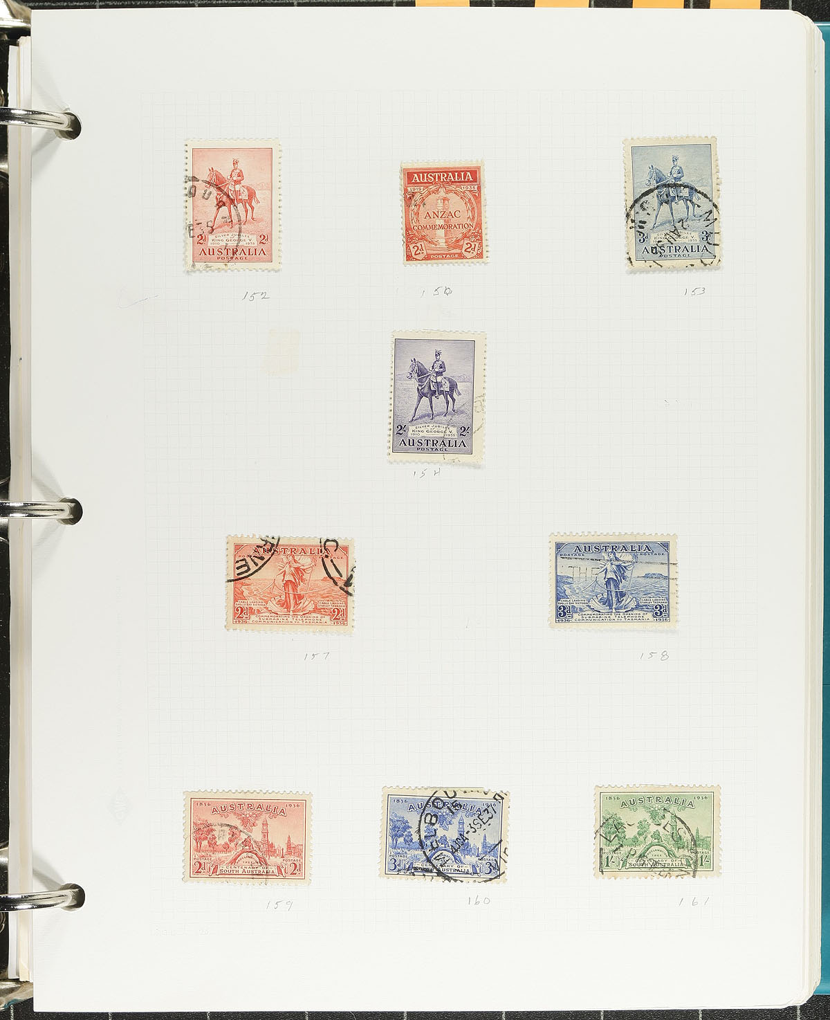 Nice collection of primarily used Australia. 1913-1999, containing roughly 1,500 stamps on over 85 homemade pages housed in a thick binder. This well organized collection generally ranges from Scott #1/1746. including a good selection of used Kangaroos with #s 5, 6 (x2), 8-10. 38-39, 42, 45-52, along with KGV Heads, several sets and partial sets, and a small selection of back of the book material. The collection also includes a few perforation varieties, shades, and a few mint stamps (mostly gutter pairs from the 1980's onwards). A spot check indicated some material cataloguing $15 and up, with the owner's 2001 Sedona retail catalogue value for the collection totaling $1,492.00 (US$). A nice lot for Australia or British Commonwealth collectors, overall fine to very fine. Estimate =