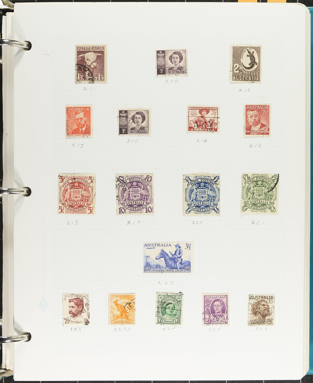 Nice collection of primarily used Australia. 1913-1999, containing roughly 1,500 stamps on over 85 homemade pages housed in a thick binder. This well organized collection generally ranges from Scott #1/1746. including a good selection of used Kangaroos with #s 5, 6 (x2), 8-10. 38-39, 42, 45-52, along with KGV Heads, several sets and partial sets, and a small selection of back of the book material. The collection also includes a few perforation varieties, shades, and a few mint stamps (mostly gutter pairs from the 1980's onwards). A spot check indicated some material cataloguing $15 and up, with the owner's 2001 Sedona retail catalogue value for the collection totaling $1,492.00 (US$). A nice lot for Australia or British Commonwealth collectors, overall fine to very fine. Estimate =