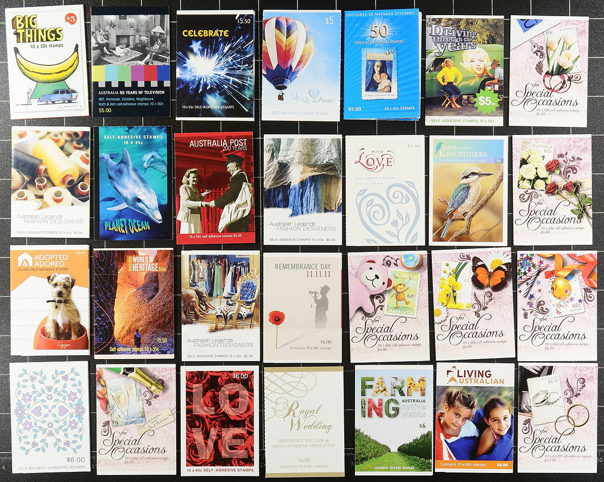 Collection of 100 Australia booklets, appearing to have no duplication, generally ranging from 2000 to 2010, but did spot a few earlier issues. Most of the denominations range from 45c to 60c, with a face value totaling $627.00 AUD, and a few booklets cataloguing in the $10 to $20 range each. A nice clean lot with a variety of purposes. Estimate =