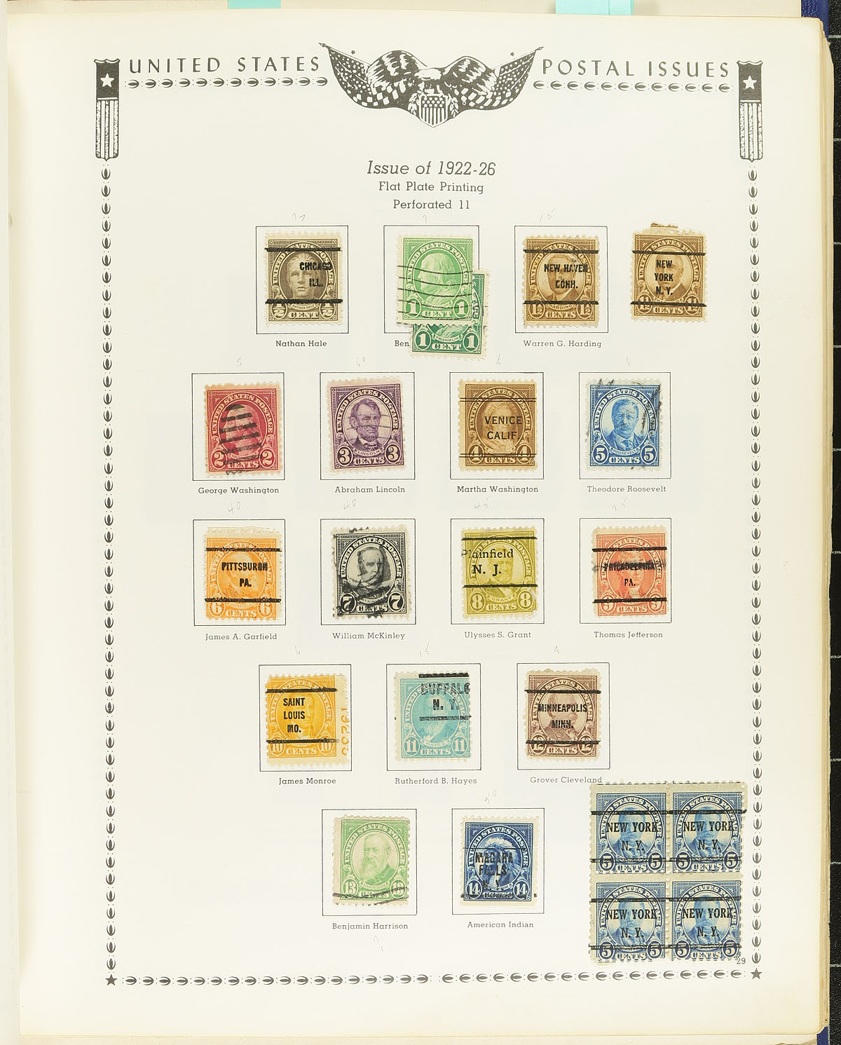 Collection of primarily used United States, 1853-1987, containing over 1,500 stamps in two volumes. The first volume contains Minkus album pages in a Harris album, with roughly 1,300 used stamps ranging from Scott #11A/1682, containing mostly pre-1920 issues, along with coils, precancels, and a few back of the book issues. The second volume contains a variety of mint stamps from the 1980's, along with souvenir cards. A spot check indicated a few stamps cataloguing $10 and up, with face value estimated in the $75 to $100 range. A good starter collection, noting a few faults with some of the early issues. Estimate =
