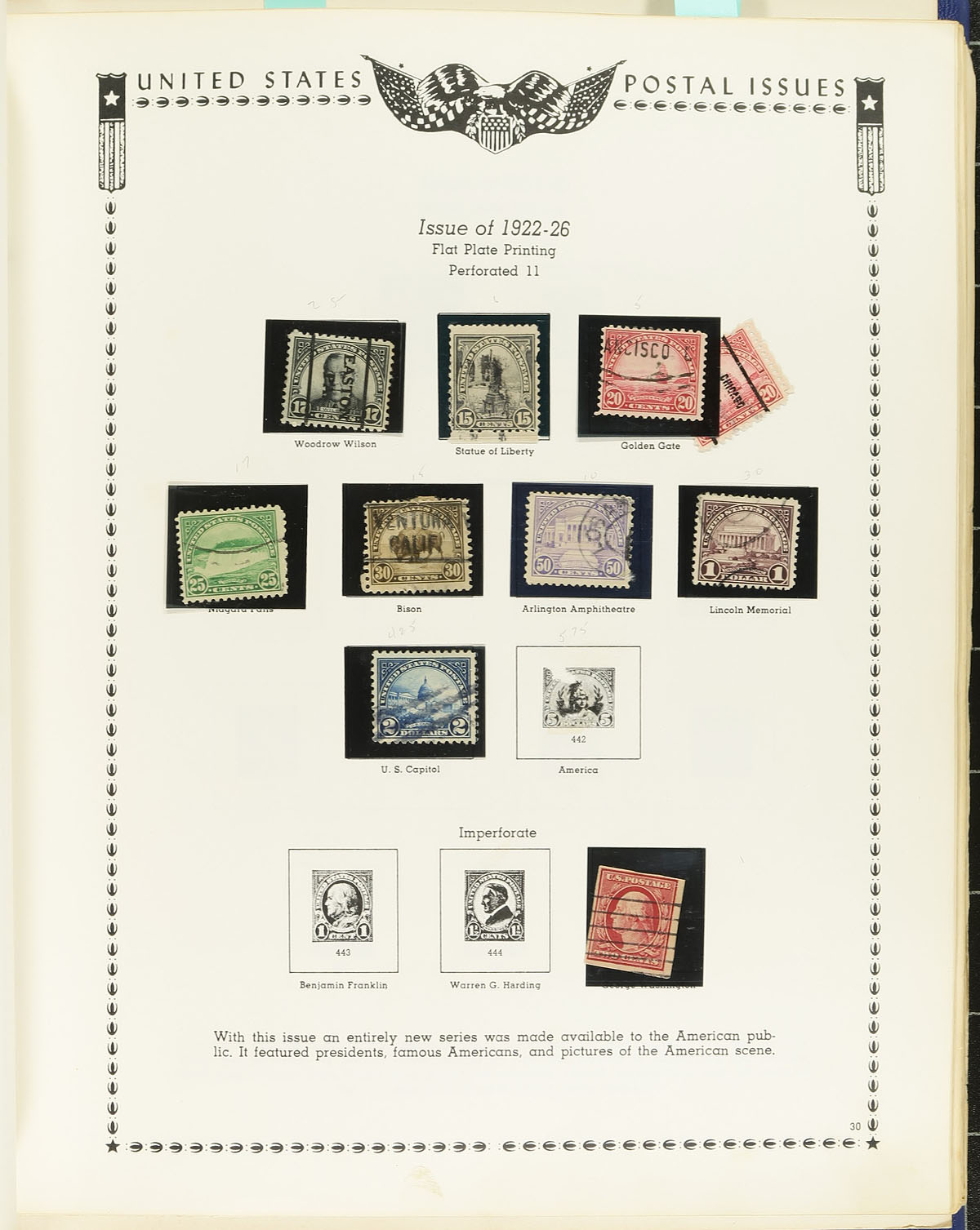 Collection of primarily used United States, 1853-1987, containing over 1,500 stamps in two volumes. The first volume contains Minkus album pages in a Harris album, with roughly 1,300 used stamps ranging from Scott #11A/1682, containing mostly pre-1920 issues, along with coils, precancels, and a few back of the book issues. The second volume contains a variety of mint stamps from the 1980's, along with souvenir cards. A spot check indicated a few stamps cataloguing $10 and up, with face value estimated in the $75 to $100 range. A good starter collection, noting a few faults with some of the early issues. Estimate =