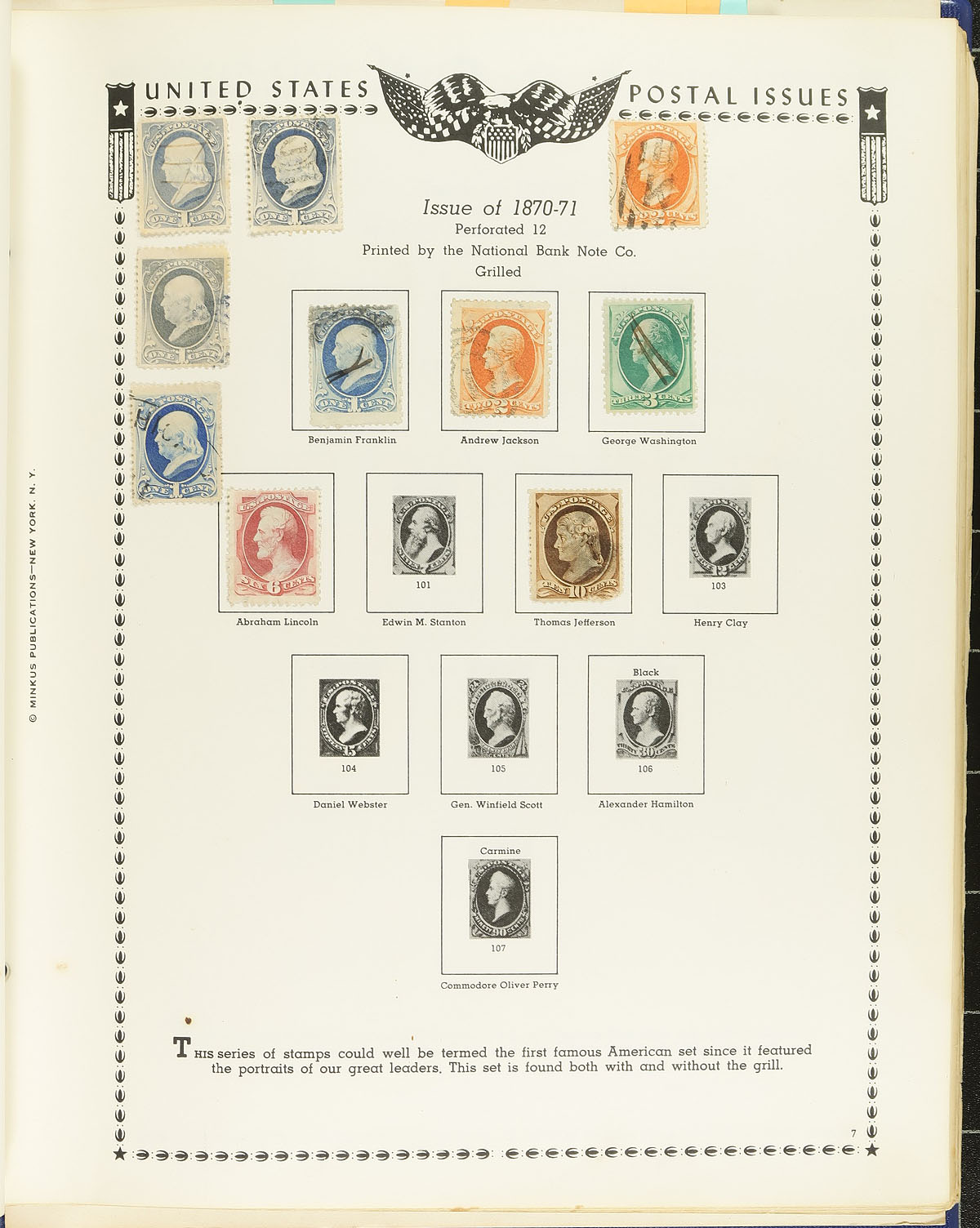 Collection of primarily used United States, 1853-1987, containing over 1,500 stamps in two volumes. The first volume contains Minkus album pages in a Harris album, with roughly 1,300 used stamps ranging from Scott #11A/1682, containing mostly pre-1920 issues, along with coils, precancels, and a few back of the book issues. The second volume contains a variety of mint stamps from the 1980's, along with souvenir cards. A spot check indicated a few stamps cataloguing $10 and up, with face value estimated in the $75 to $100 range. A good starter collection, noting a few faults with some of the early issues. Estimate =