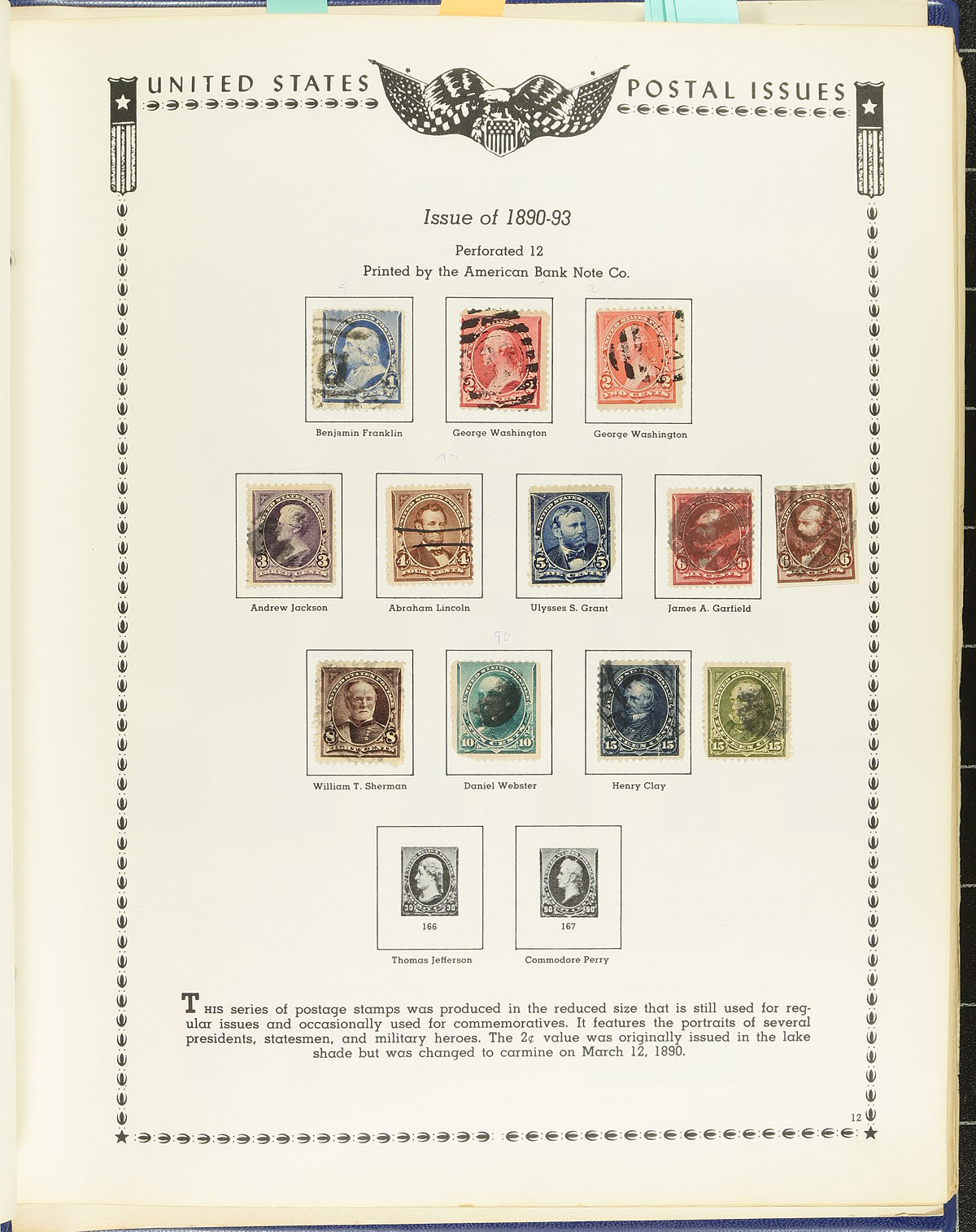 Collection of primarily used United States, 1853-1987, containing over 1,500 stamps in two volumes. The first volume contains Minkus album pages in a Harris album, with roughly 1,300 used stamps ranging from Scott #11A/1682, containing mostly pre-1920 issues, along with coils, precancels, and a few back of the book issues. The second volume contains a variety of mint stamps from the 1980's, along with souvenir cards. A spot check indicated a few stamps cataloguing $10 and up, with face value estimated in the $75 to $100 range. A good starter collection, noting a few faults with some of the early issues. Estimate =
