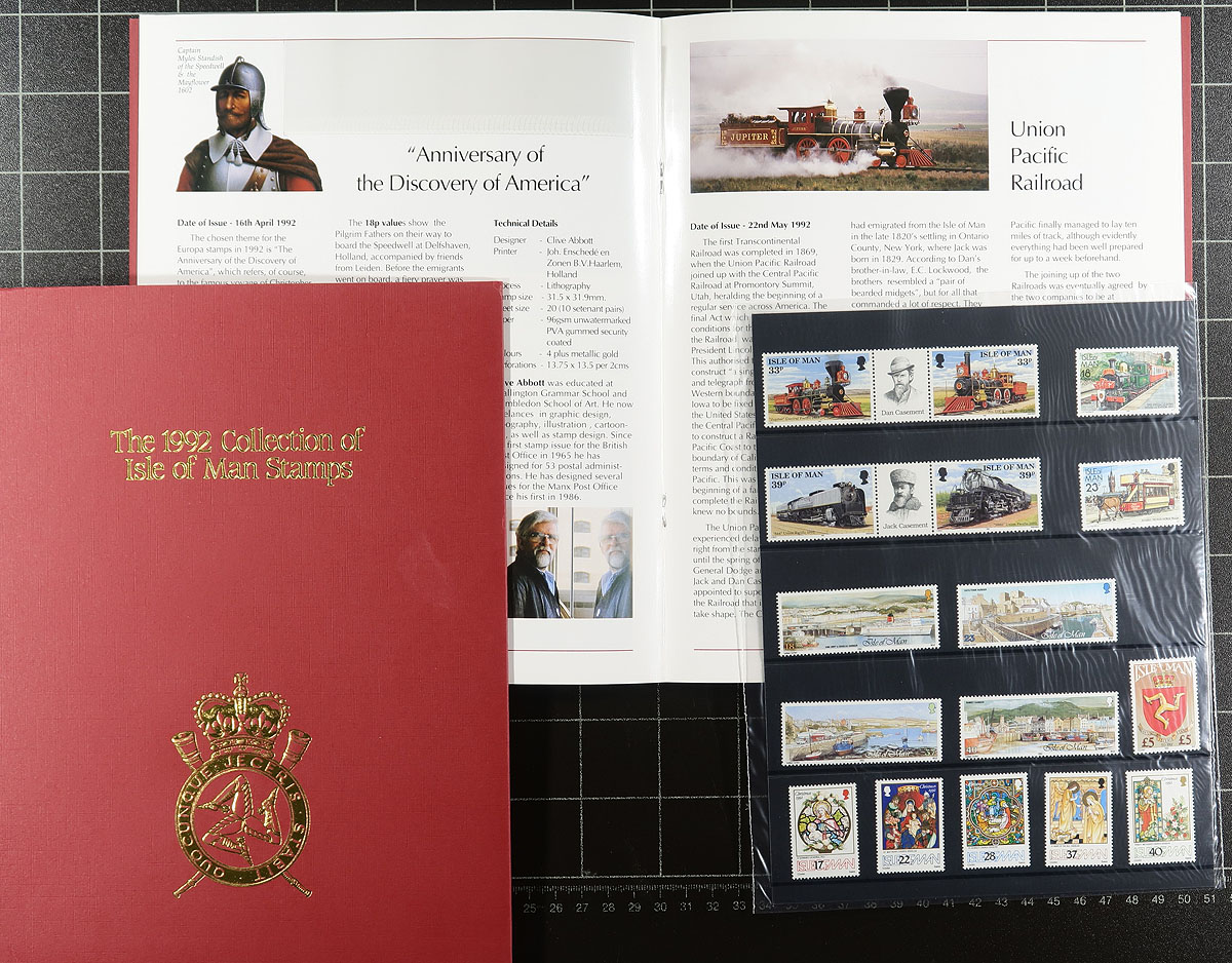 Nice group of Isle of Man annual collections, 1988-1997, all in very nice folders, ranging from Scott #347/765 (only missing a few issues from 1992), including strips, souvenir sheets, and sheetlets. A nice clean lot for all collectors. 2026 Scott US$415.00 =