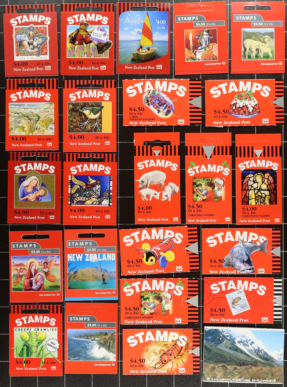 Group of roughly 100 New Zealand booklets, generally ranging from the 1990's to roughly 2008, including a few "Postage Paid" issues, and roughly 15 souvenir miniature sheet booklets. A spot check indicated a few booklets cataloguing from $15 to $30 and up, with face value alone totaling NZ$623.00. Some mild duplication for a few issues, still a nice clean lot for collectors, dealers, or postage users. Estimate =