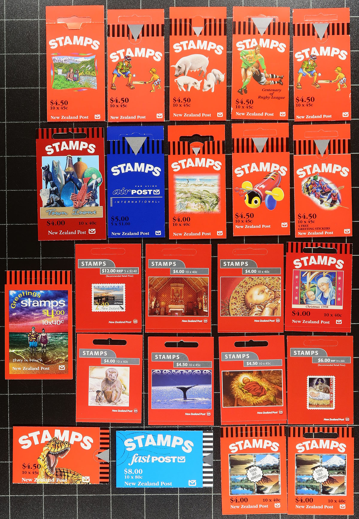 Group of roughly 100 New Zealand booklets, generally ranging from the 1990's to roughly 2008, including a few "Postage Paid" issues, and roughly 15 souvenir miniature sheet booklets. A spot check indicated a few booklets cataloguing from $15 to $30 and up, with face value alone totaling NZ$623.00. Some mild duplication for a few issues, still a nice clean lot for collectors, dealers, or postage users. Estimate =