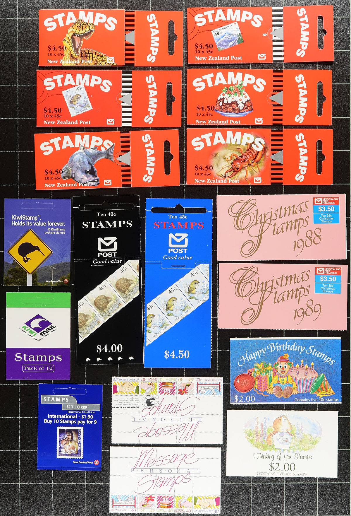 Group of roughly 100 New Zealand booklets, generally ranging from the 1990's to roughly 2008, including a few "Postage Paid" issues, and roughly 15 souvenir miniature sheet booklets. A spot check indicated a few booklets cataloguing from $15 to $30 and up, with face value alone totaling NZ$623.00. Some mild duplication for a few issues, still a nice clean lot for collectors, dealers, or postage users. Estimate =