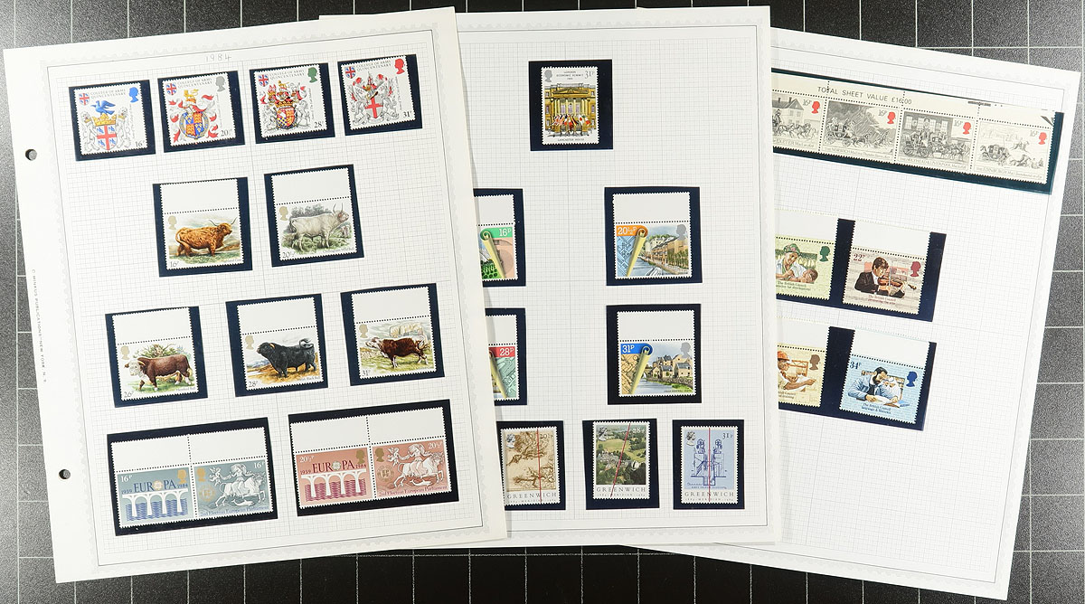 Collection of never hinged Great Britain, 1971-1987, containing roughly 500 different stamps in hingeless mounts on many homemade pages, and 2 stockpages. This neatly organized collection ranges from Scott #648/1200, including a few blocks and gutter pairs and sets. Face value alone totals £155.00. A nice clean lot with a variety of purposes, overall very fine. Estimate =