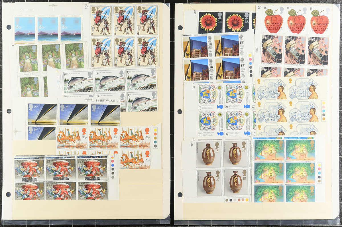 Collection of never hinged Great Britain, 1971-1987, containing roughly 500 different stamps in hingeless mounts on many homemade pages, and 2 stockpages. This neatly organized collection ranges from Scott #648/1200, including a few blocks and gutter pairs and sets. Face value alone totals £155.00. A nice clean lot with a variety of purposes, overall very fine. Estimate =