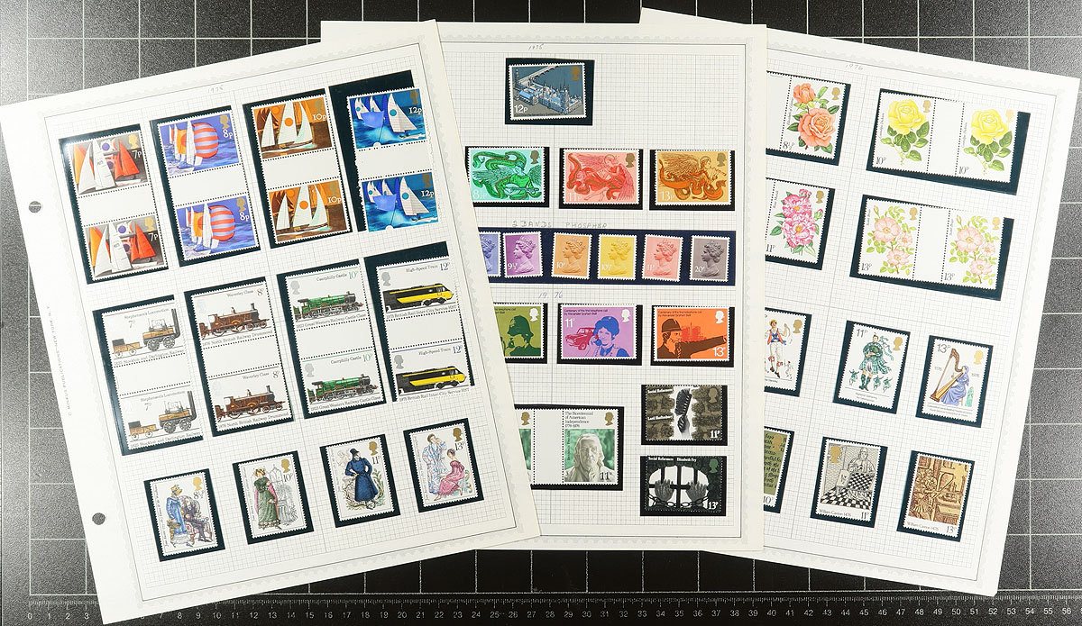 Collection of never hinged Great Britain, 1971-1987, containing roughly 500 different stamps in hingeless mounts on many homemade pages, and 2 stockpages. This neatly organized collection ranges from Scott #648/1200, including a few blocks and gutter pairs and sets. Face value alone totals £155.00. A nice clean lot with a variety of purposes, overall very fine. Estimate =
