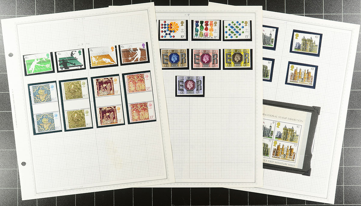 Collection of never hinged Great Britain, 1971-1987, containing roughly 500 different stamps in hingeless mounts on many homemade pages, and 2 stockpages. This neatly organized collection ranges from Scott #648/1200, including a few blocks and gutter pairs and sets. Face value alone totals £155.00. A nice clean lot with a variety of purposes, overall very fine. Estimate =