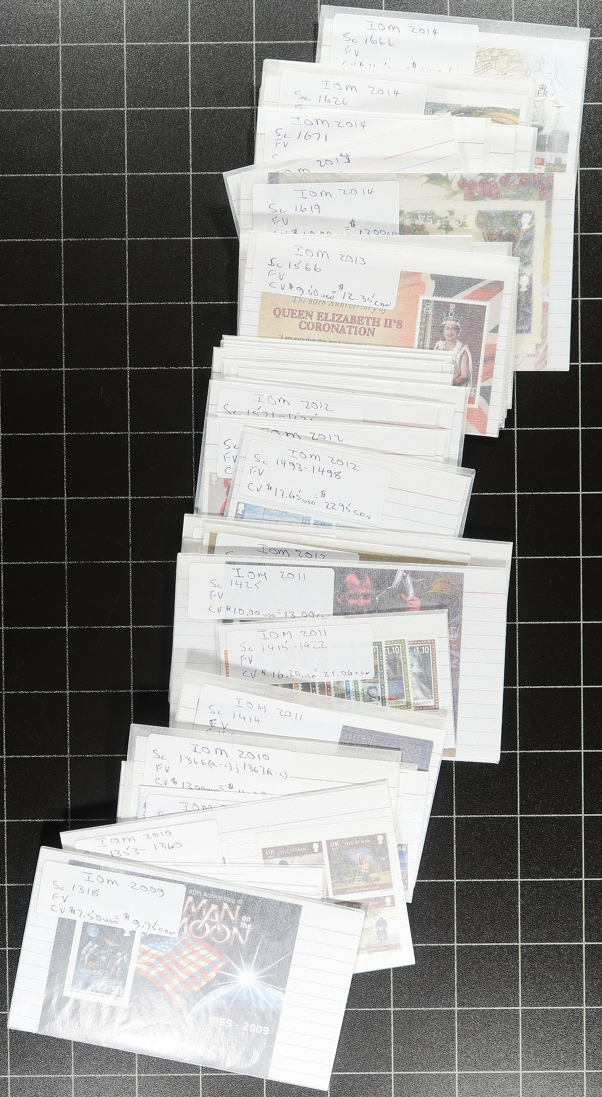 Nice collection of never hinged Isle of Man, 1958-2014, containing a few thousand stamps all in well described glassines loose in a box. The collection consists of a few hundred glassines, containing sets, along with souvenir sheets and a few sheetlets, ranging from Scott #1/1666. We estimate roughly 80% completeness in period, with some mild duplication for some issues. Owner's older Scott catalogue value in excess of $2,500. A nice lot for collectors and dealers alike. Estimate =