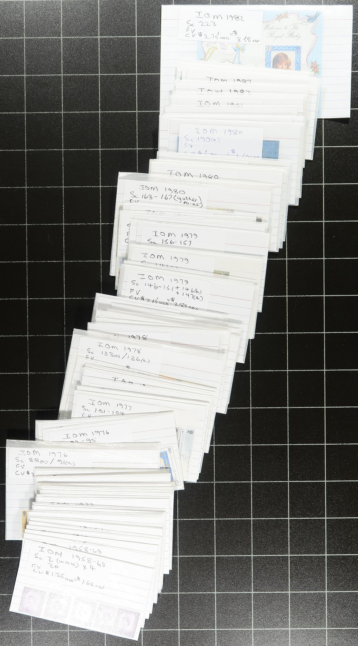 Nice collection of never hinged Isle of Man, 1958-2014, containing a few thousand stamps all in well described glassines loose in a box. The collection consists of a few hundred glassines, containing sets, along with souvenir sheets and a few sheetlets, ranging from Scott #1/1666. We estimate roughly 80% completeness in period, with some mild duplication for some issues. Owner's older Scott catalogue value in excess of $2,500. A nice lot for collectors and dealers alike. Estimate =