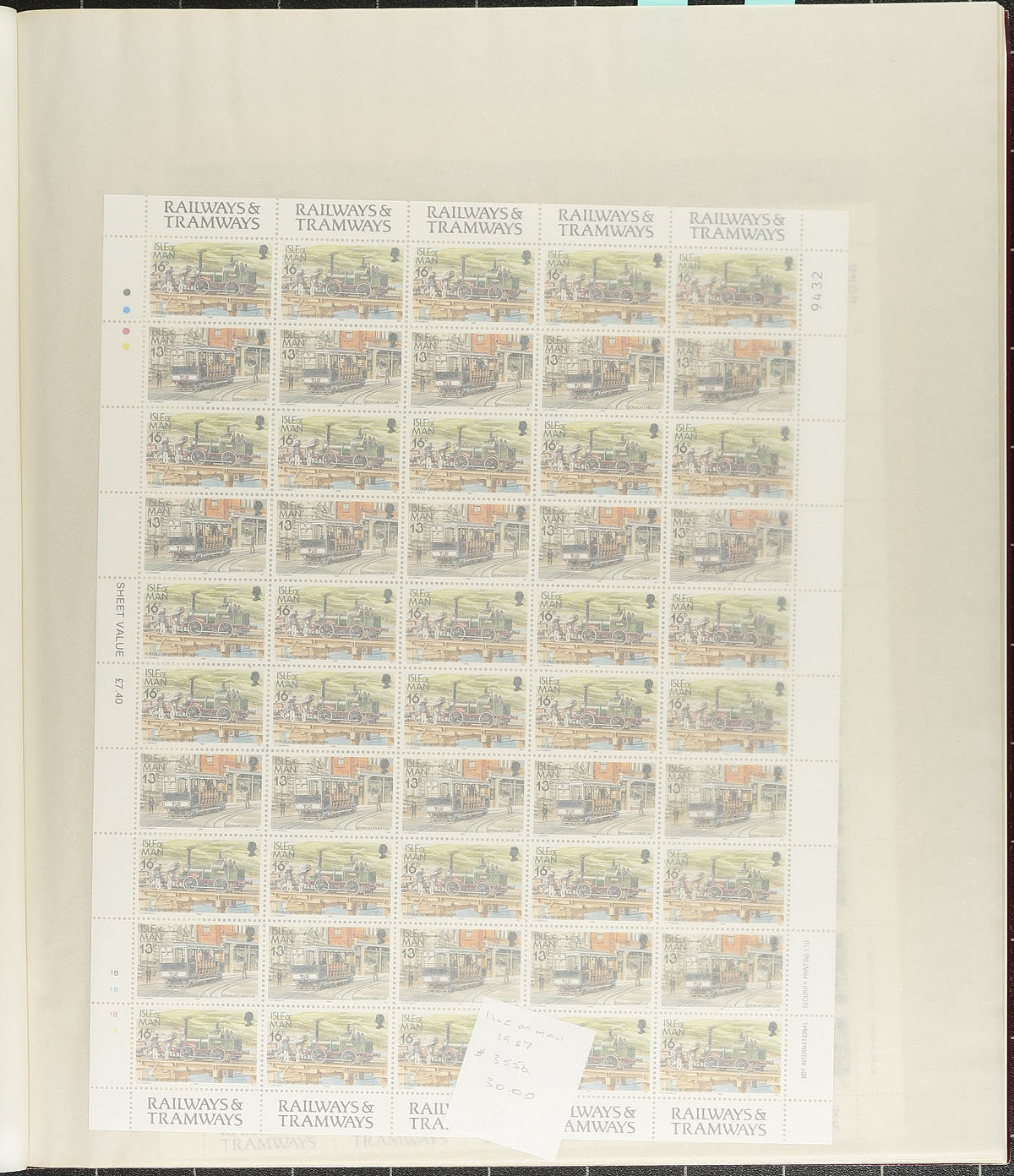 Group of never hinged Channel Islands complete sheets, 1970s-1980s, containing 20 sheets from Isle of Man, and 15 sheets from Guernsey in two sheet files. A spot check indicated gutter sheets, along with traffic light blocks, with a few sheets cataloguing $20 and up. Owner's older catalogue value for the collection totals US$405.00. A few edge faults with a few Guernsey sheets due to the size of the sheets. A nice lot for the sheet collector, overall fine to very fine. Estimate =